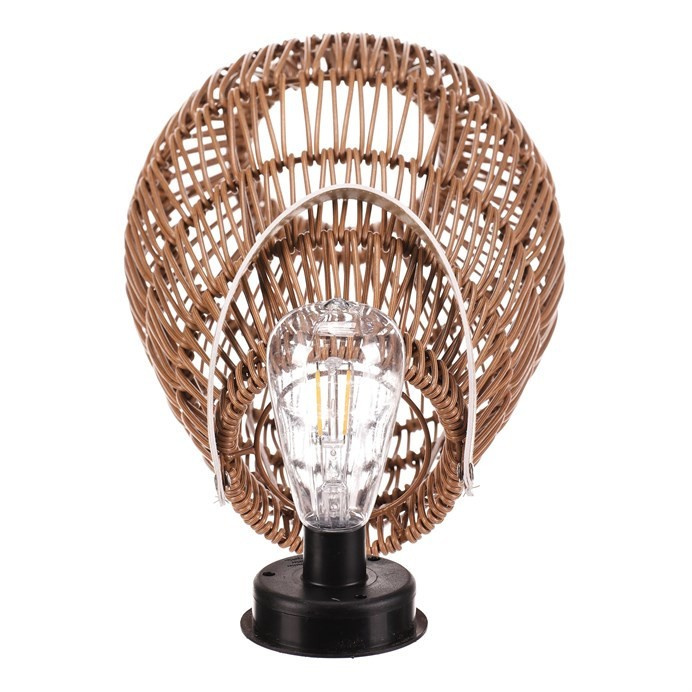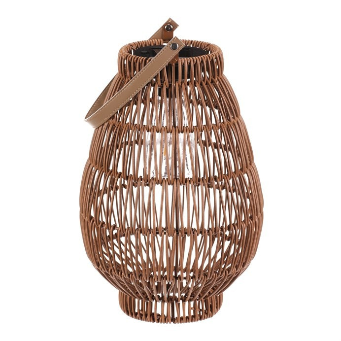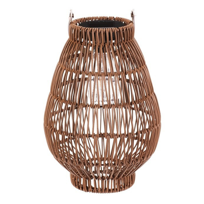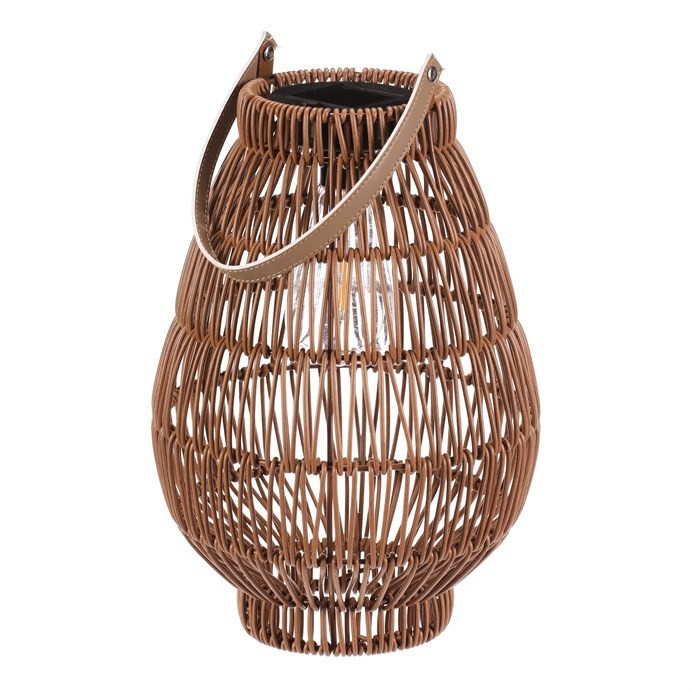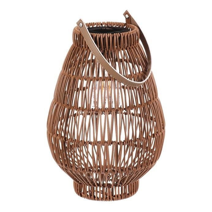 Lampión z polyratanu v tvaru hrušky vyniká světle hnědým provedením, které přináší příjemnou přírodní atmosféru. Osvětlení zajišťuje integrovaná LED technologie napájená solárním panelem, což umožňuje bezdrátový provoz a snadné umístění kdekoliv. Praktické madlo usnadňuje přenášení nebo zavěšení lampiónu. Díky otevřené struktuře polyratanového těla světlo vytváří zajímavý vizuální efekt a prostor příjemně zútulní. Velikost M je vhodná pro použití na terase, balkóně nebo v interiéru jako dekorativní prvek. LED osvětlení je napájeno 1 x AA dobíjecí baterií a zároveň solárním panelem umístěným na horní hraně.
