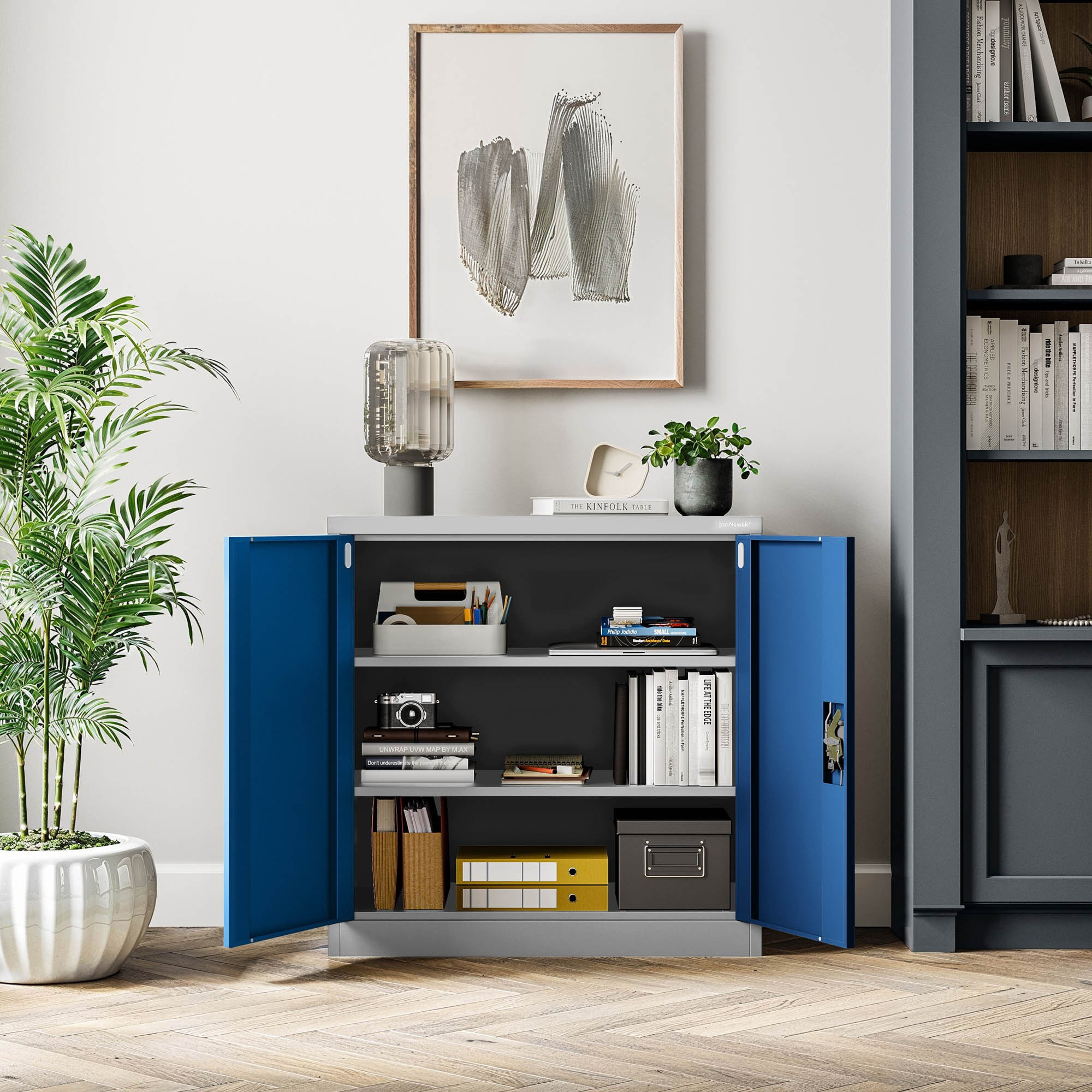 Zapomeňte na nudné a strohé kovové skříňky! Skříňka BEATA v šedo-modré kombinaci je moderní a elegantní doplněk, který se hodí do různých typů interiérů. Je ideální pro: