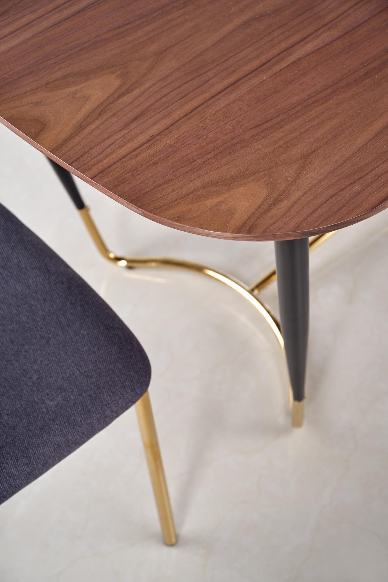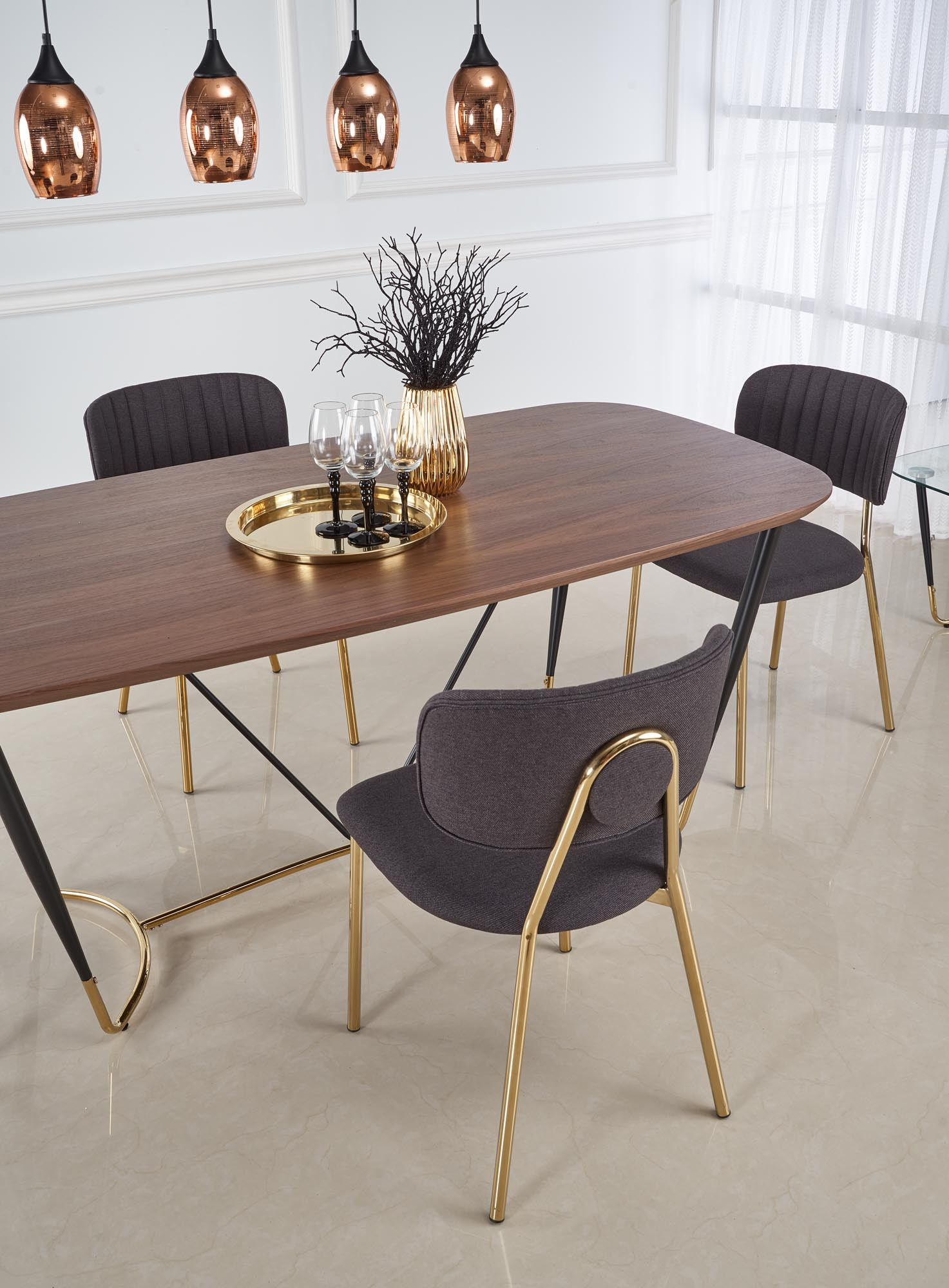 rozměry: 180/90/76 cm, materiál: MDF + přírodní dýha / práškově lakovaná ocel / chromovaná ocel, barva: deska stolu - ořech, nohy - černá / zlatá