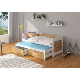 Dvojlůžko TIARRO je ideálním řešením v pokoji pro dva sourozence. Dokonale se osvědčí také v případě návštěvy nečekaných hostů. Model je dostupný ve dvou velikostech a v mnoha barvách, které se hodí do každého uspořádání. Postel má dvě praktické a funkční zásuvky na ložní prádlo a odolný a pevný rám vyrobený z borovicového dřeva. Spolu s postelí obdržíš sadu pěnových matrací o tloušťce 8 cm.