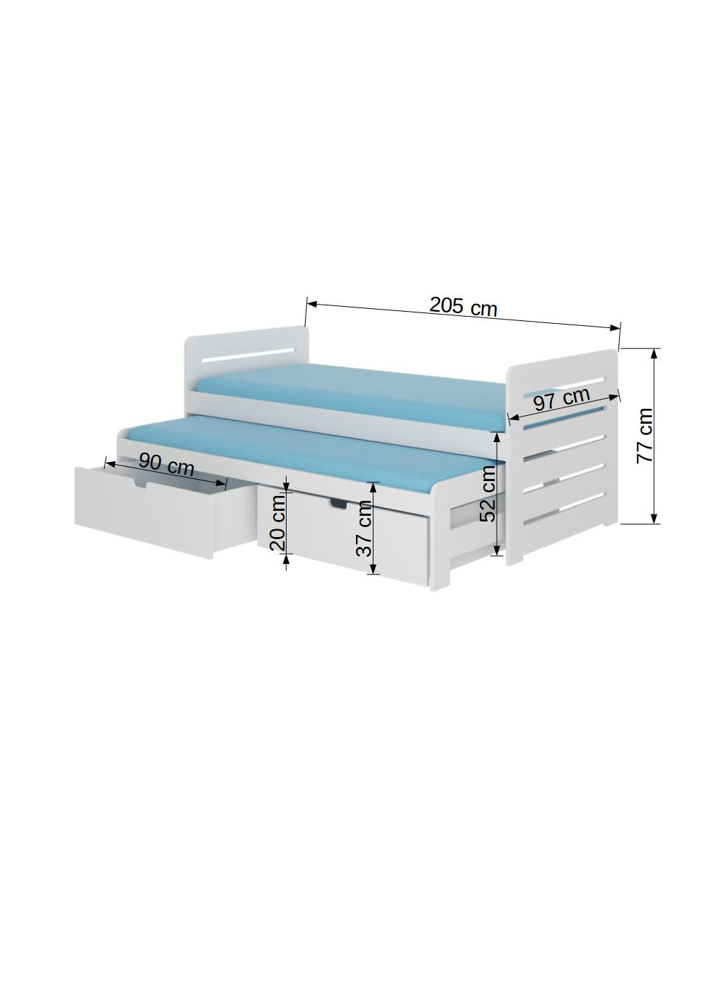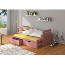 Dvojitá postel TOMI je ideálním řešením v pokoji pro dva sourozence. Dokonale se osvědčí také v případě návštěvy nečekaných hostů. Model je dostupný ve dvou velikostech a v mnoha barvách, které se hodí do každého uspořádání. Postel má dvě praktické a funkční zásuvky na ložní prádlo a odolný a pevný rám vyrobený z borovicového dřeva. Spolu s postelí obdržíš sadu pěnových matrací o tloušťce 8 cm.