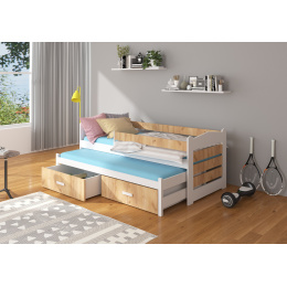 Dvojlůžko s bariérkou TIARRO je ideálním řešením do pokoje pro dva sourozence. Dokonale se osvědčí také v případě návštěvy nečekaných hostů. Model je dostupný ve dvou velikostech a v mnoha barvách, které se hodí do každého uspořádání. Postel má dvě praktické a funkční zásuvky na ložní prádlo a odolný a pevný rám vyrobený z borovicového dřeva. Pro zvýšení bezpečnosti vašeho dítěte byl model doplněn o další zábradlí chránící před pádem. Matrace nejsou součástí postele.