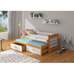 Dvojlůžko s bariérkou TIARRO je ideálním řešením do pokoje pro dva sourozence. Dokonale se osvědčí také v případě návštěvy nečekaných hostů. Model je dostupný ve dvou velikostech a v mnoha barvách, které se hodí do každého uspořádání. Postel má dvě praktické a funkční zásuvky na ložní prádlo a odolný a pevný rám vyrobený z borovicového dřeva. Pro zvýšení bezpečnosti vašeho dítěte byl model doplněn o další zábradlí chránící před pádem. Matrace nejsou součástí postele.