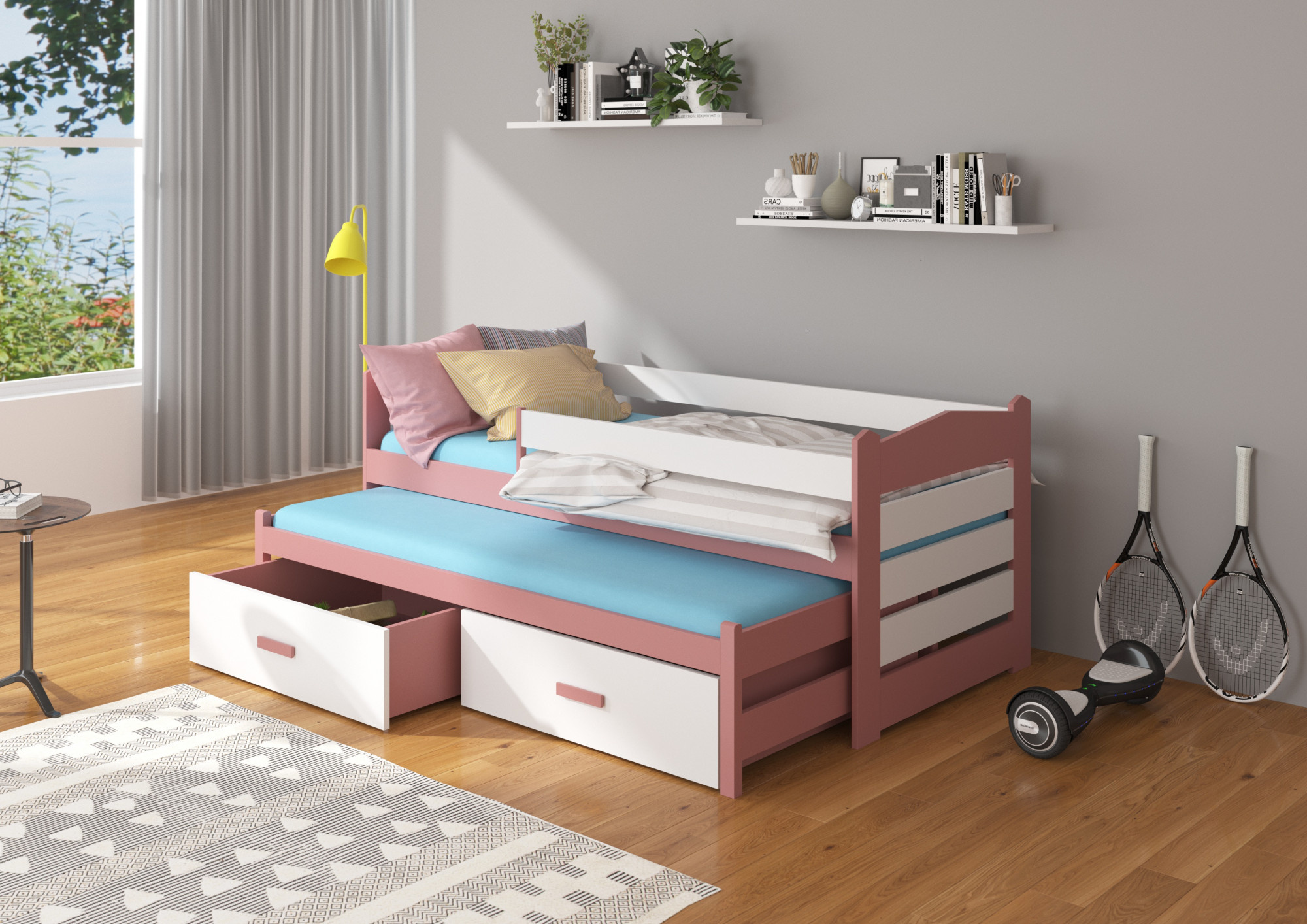 Dvojlůžko s bariérkou TIARRO je ideálním řešením do pokoje pro dva sourozence. Dokonale se osvědčí také v případě návštěvy nečekaných hostů. Model je dostupný ve dvou velikostech a v mnoha barvách, které se hodí do každého uspořádání. Postel má dvě praktické a funkční zásuvky na ložní prádlo a odolný a pevný rám vyrobený z borovicového dřeva. Pro zvýšení bezpečnosti vašeho dítěte byl model doplněn o další zábradlí chránící před pádem. Matrace nejsou součástí postele.