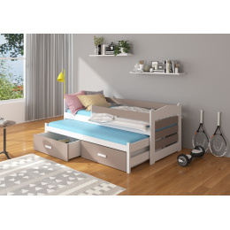 Dvojlůžko s bariérkou TIARRO je ideálním řešením do pokoje pro dva sourozence. Dokonale se osvědčí také v případě návštěvy nečekaných hostů. Model je dostupný ve dvou velikostech a v mnoha barvách, které se hodí do každého uspořádání. Postel má dvě praktické a funkční zásuvky na ložní prádlo a odolný a pevný rám vyrobený z borovicového dřeva. Pro zvýšení bezpečnosti vašeho dítěte byl model doplněn o další zábradlí chránící před pádem. Matrace nejsou součástí postele.