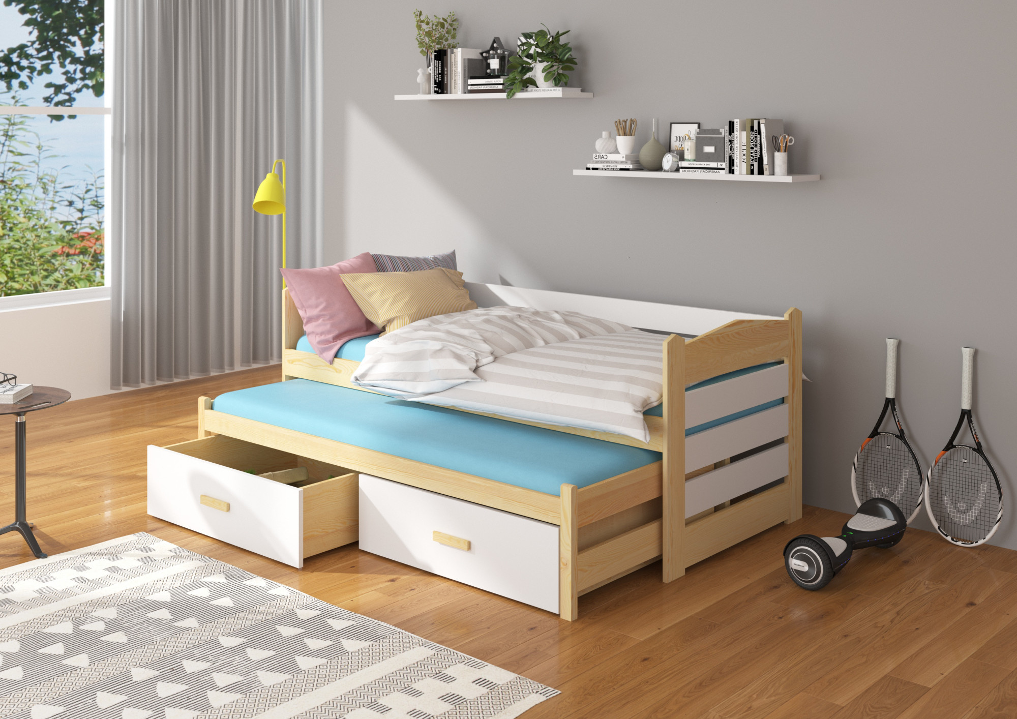 Dvojlůžko TIARRO je ideálním řešením v pokoji pro dva sourozence. Dokonale se osvědčí také v případě návštěvy nečekaných hostů. Model je dostupný ve dvou velikostech a v mnoha barvách, které se hodí do každého uspořádání. Postel má dvě praktické a funkční zásuvky na ložní prádlo a odolný a pevný rám vyrobený z borovicového dřeva. Matrace nejsou součástí postele.
