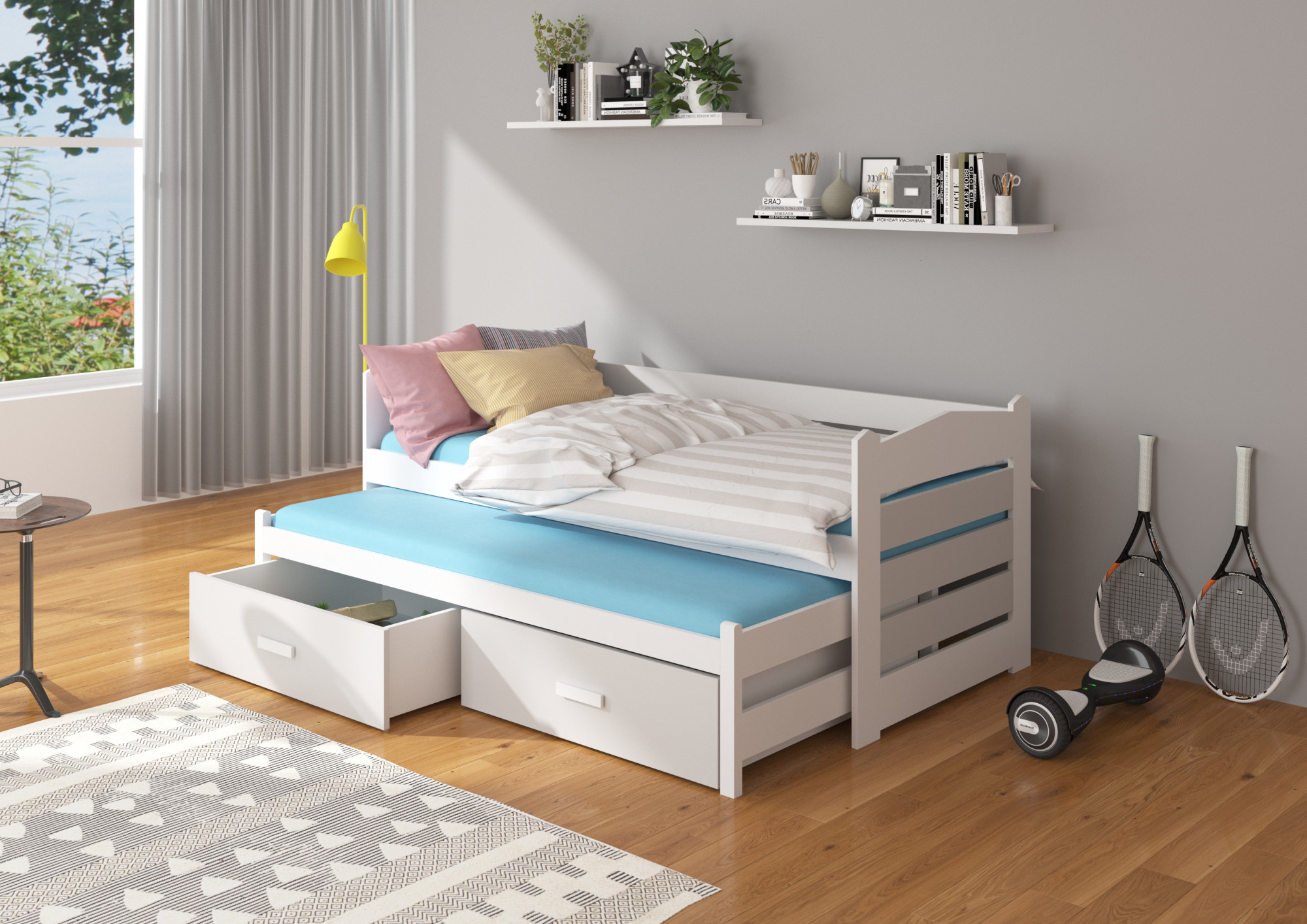 Dvojlůžko TIARRO je ideálním řešením v pokoji pro dva sourozence. Dokonale se osvědčí také v případě návštěvy nečekaných hostů. Model je dostupný ve dvou velikostech a v mnoha barvách, které se hodí do každého uspořádání. Postel má dvě praktické a funkční zásuvky na ložní prádlo a odolný a pevný rám vyrobený z borovicového dřeva. Matrace nejsou součástí postele.