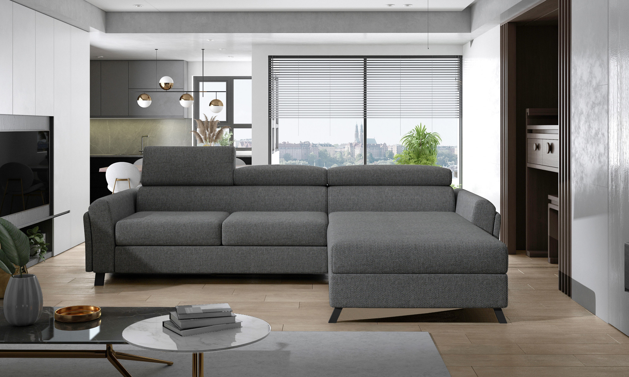 Mariall je klasická, přesto pohodlná a elegantní rohová pohovka ve tvaru L, měřící 300 x 190 x 98 cm. Jeho charakteristické rysy zahrnují: nastavitelné opěrky hlavy, čalouněné opěradlo pohovky, elegantní kovové nohy s dřevěným povrchem a hluboké, měkké sedadlo vyrobené z inovativní pěny T30 a HR, které jsou odolné vůči deformaci a poškození. Kromě toho zaručují maximální pohodlí jak během denního odpočinku, tak při spánku. Díky své funkci spaní je Mariall multifunkční kus nábytku. Po rozložení pohovky pomocí intuitivního a jednoduchého mechanismu delfín získáme prostornou postel o rozměrech 110 x 240 cm a také prostorný, hluboký úložný prostor na lůžkoviny umístěný v otomanu. Pokud hledáte funkční, a přitom klasický a elegantní kus nábytku - může být jen jedna volba - s čistým svědomím doporučujeme rohovou pohovku Mariall, která je odpovědí na všechny otázky.