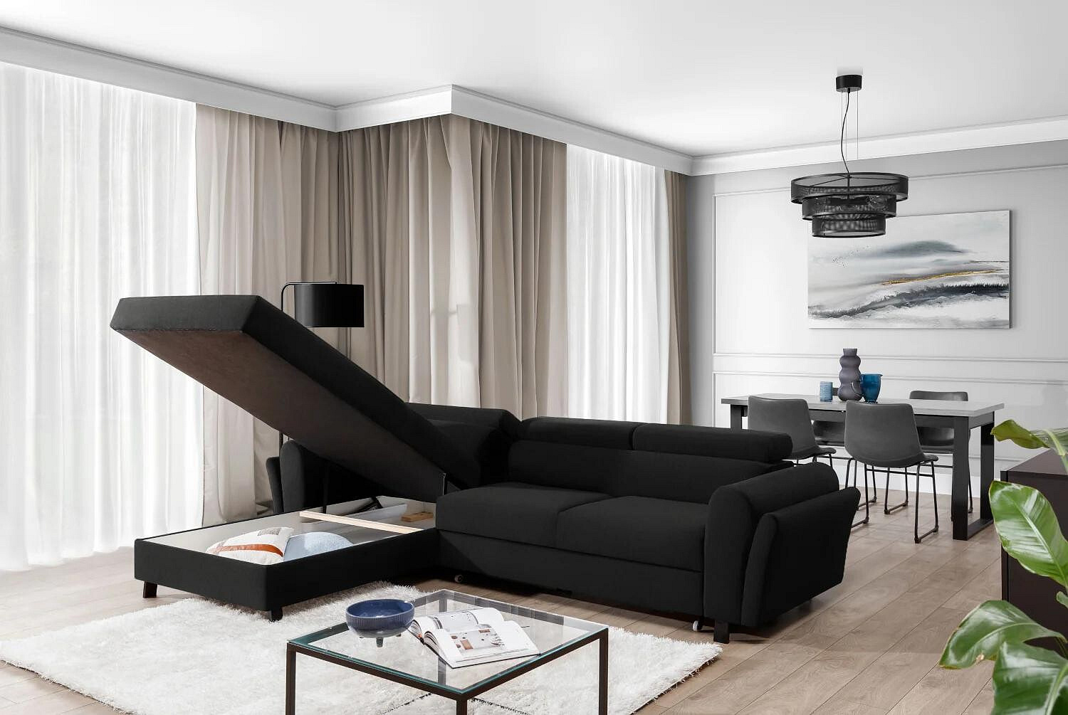 Jednou z hlavních předností této sedací soupravy je její praktická funkčnost. Díky možnosti rozkládání se snadno promění v pohodlné lůžko s plochou na spaní 110x240 cm, což je ideální pro hosty nebo pro příležitostné přespání. Navíc je vybavena úložným prostorem, který poskytuje dostatek místa pro uložení lůžkovin, polštářů nebo jiných potřebných věcí, čímž pomáhá udržovat váš obývací prostor čistý a uspořádaný.