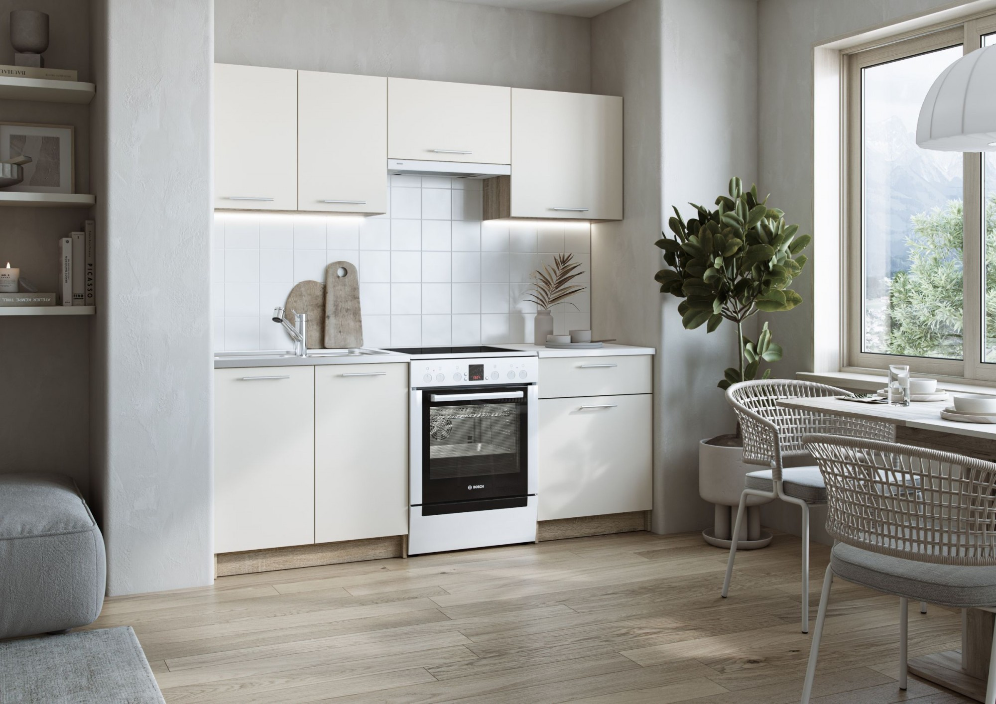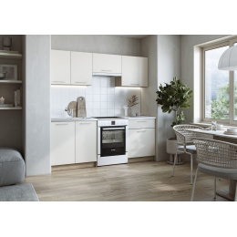délka sestavy: 200 cm, plynové výtahy, tloušťka horní desky: 28 mm, barvy: přední strana - vanilka, korpus - dub sonoma, horní deska - bílá