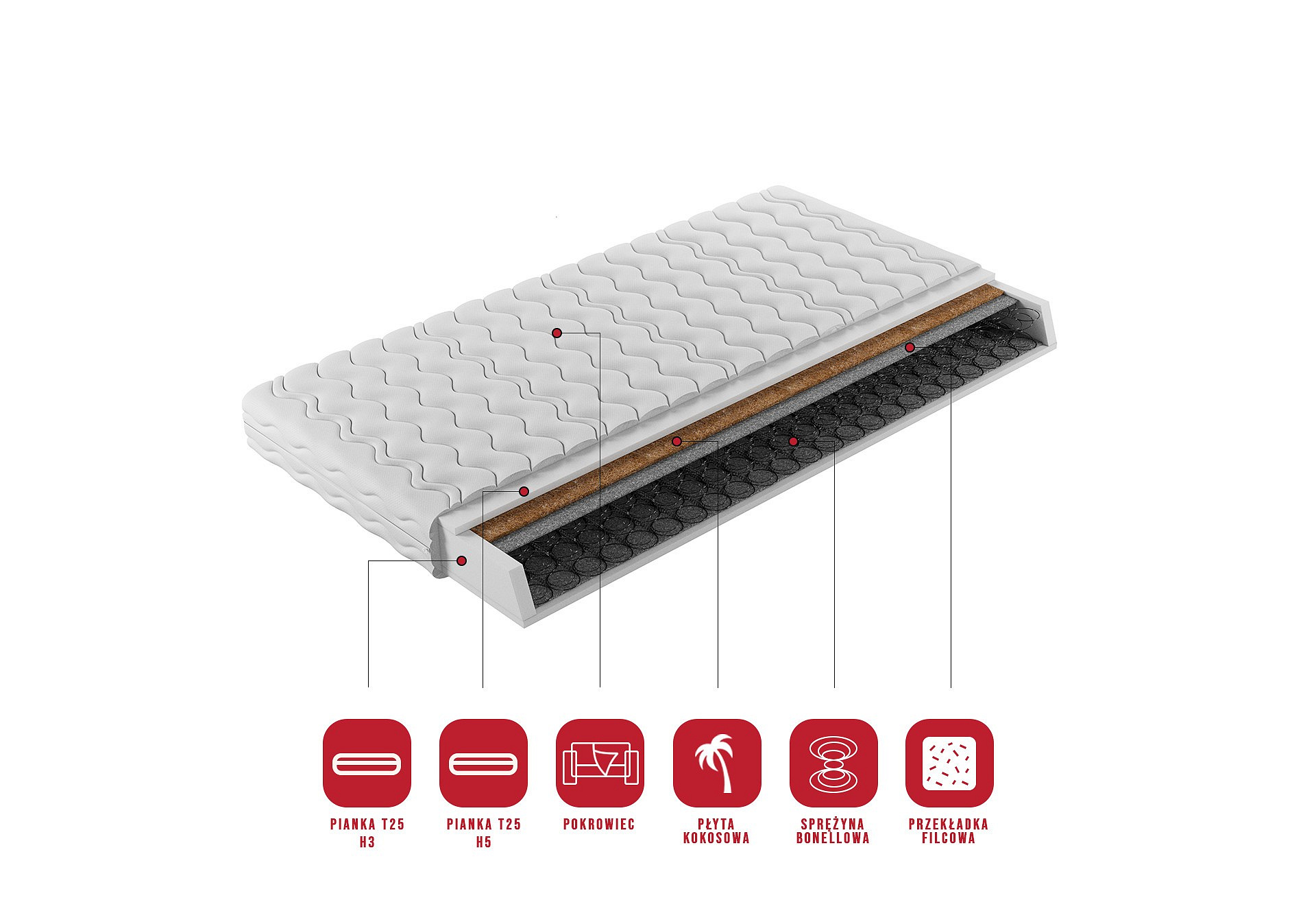 Matrace bonellová PRESTIN se skládá z pružiny typu bonell, jejíž hlavní výhodou je plošná pružnost, díky které je matrace vhodná pro každou osobu. Co více, výplň matrace byla vyrobena z vysoce kvalitní polyuretanové pěny T25 se dvěma stranami tvrdosti H5 a H3 - tvrdou a středně tvrdou. Pro zlepšení komfortu odpočinku je model PRESTIN vybaven kokosovou deskou o výšce 1 cm. Taková kombinace zajišťuje, že matrace má dobrou odolnost a cirkulaci vzduchu. Důležitou vlastností jsou také jeho hypoalergenní vlastnosti. Antialergický, prošívaný potah nepřitahuje prach, roztoče ani jiné alergeny, což z něj činí oblíbenou volbu pro osoby se sklonem k alergiím a podráždění pokožky. Navíc jej lze prát v pračce na 40 stupňů Celsia, což ještě více usnadňuje udržování správné hygieny spánku. Povlak má zip, díky čemuž ho lze snadno sundat a nasadit.