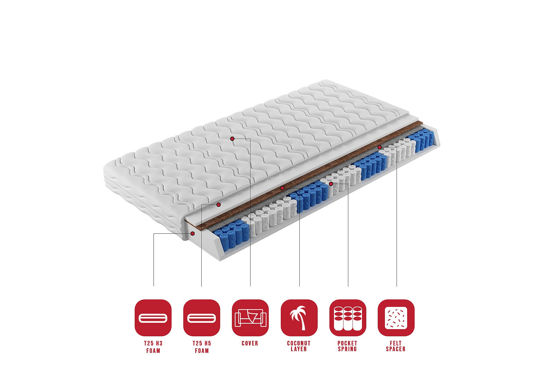 Matrace s kapsami NEVA se vyznačuje vysokou pružností a bodovou podporou těla během spánku, což zajišťuje odlehčení páteře a lepší odpočinek. Výplň matrace byla vyrobena z vysoce kvalitní polyuretanové pěny T25 se dvěma stranami tvrdosti H5 a H3 - tvrdou a středně tvrdou. Pro zlepšení komfortu odpočinku je model NEVA vybaven kokosovou deskou o výšce 1 cm. Taková kombinace zajišťuje, že matrace má dobrou odolnost a cirkulaci vzduchu. Důležitou vlastností jsou také jeho hypoalergenní vlastnosti. Antialergický, prošívaný potah nepřitahuje prach, roztoče ani jiné alergeny, což z něj činí oblíbenou volbu pro osoby se sklonem k alergiím a podráždění pokožky. Navíc jej lze prát v pračce na 40 stupňů Celsia, což ještě více usnadňuje udržování správné hygieny spánku. Povlak má zip, díky čemuž ho lze snadno sundat a nasadit. Model NEVA je dostupný v rozměrech: 80/90/120/140/160/180/200 x 200 cm.
