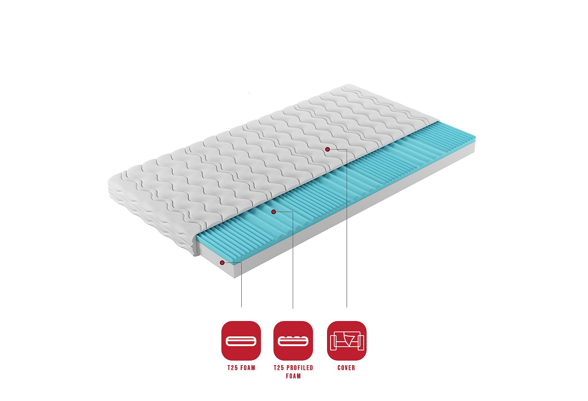 Oboustranná matrace CARL představuje nejběžnější typ pěnových matrací. Výplň matrace tvoří vysoce kvalitní polyuretanová pěna T25, jednostranně obložená profilovanou sedmizónovou pěnou. Systém se 7 zónami má vysokou bodovou pružnost, což zajišťuje správnou oporu celého těla. Důležitou vlastností matrace jsou také její hypoalergenní vlastnosti. Antialergický, prošívaný potah nepřitahuje prach, roztoče ani jiné alergeny, což z něj činí oblíbenou volbu pro osoby se sklonem k alergiím a podráždění pokožky. Navíc jej lze prát v pračce na 40 stupňů Celsia, což ještě více usnadňuje udržování správné hygieny spánku. Povlak má zip, díky čemuž ho lze snadno sundat a nasadit. Model CARL je nejen pohodlný, ale také dostupný za atraktivní cenu.