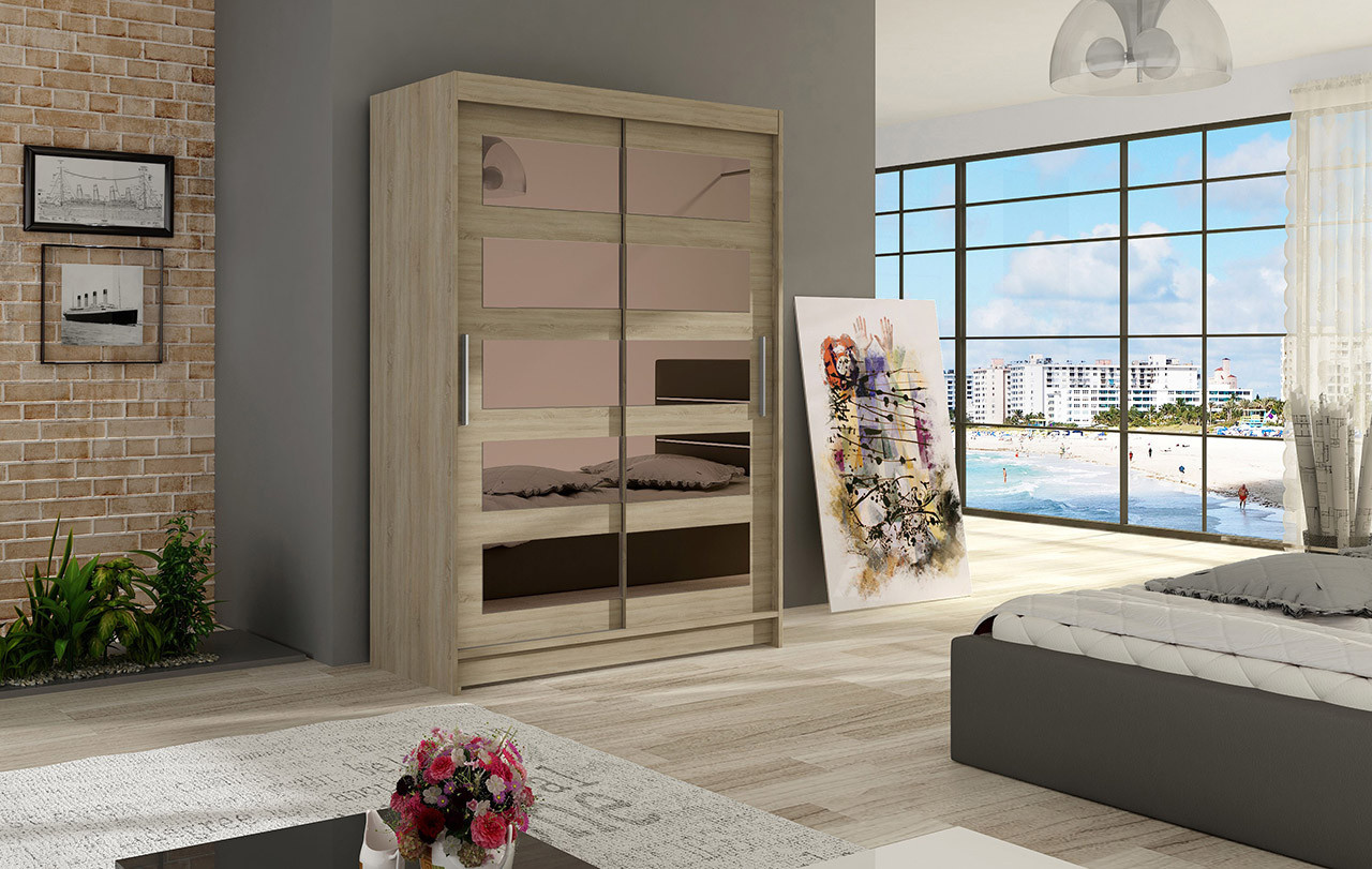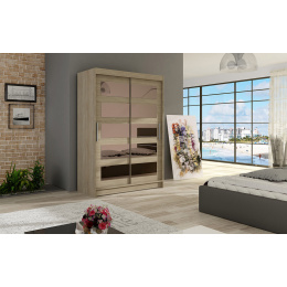 Moderní a elegantní design skříně osloví i náročné zákazníky. Eleganci podtrhují dlouhé stříbrné úchyty a moderní nádech dodávají kouřová zrcadla, která jsou nalepena na dveřích skříně. Je vyrobena z lamina o síle 16 mm a hrany jsou ukončeny ABS lištou. Vodící lišty jsou vyrobeny z odolného hliníku a splňují požadavky pro každodenní užívání. Díky svému uspořádání poskytuje dostatek úložného prostoru. Skvěle se hodí do ložnice, předsíně, dětského, nebo studentského pokoje. Skříň je dodávána v demontu a součástí je montážní plánek včetně všech potřebných spojovacích materiálů. Vyobrazené dekorace nejsou v ceně.