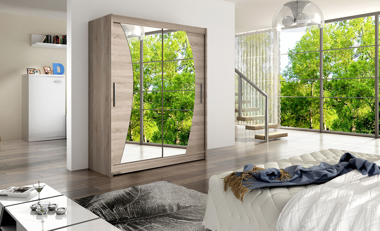 Jednoduchý a elegantní design skříně osloví i náročné zákazníky. Eleganci podtrhují dlouhé stříbrné úchyty a zrcadla, která jsou nalepena na dveřích skříně a po stranách zaříznutá do oblouku ve tvaru luku. Je vyrobena z lamina o síle 16 mm a hrany jsou ukončeny ABS lištou. Vodící lišty jsou vyrobeny z odolného hliníku a splňují požadavky pro každodenní užívání. Díky svému uspořádání poskytuje dostatek úložného prostoru a zrcadlo prostor opticky zvětší a prosvětlí. Skvěle se hodí do ložnice, předsíně, dětského, nebo studentského pokoje. Skříň je dodávána v demontu a součástí je montážní plánek včetně všech potřebných spojovacích materiálů. Vyobrazené dekorace nejsou v ceně.