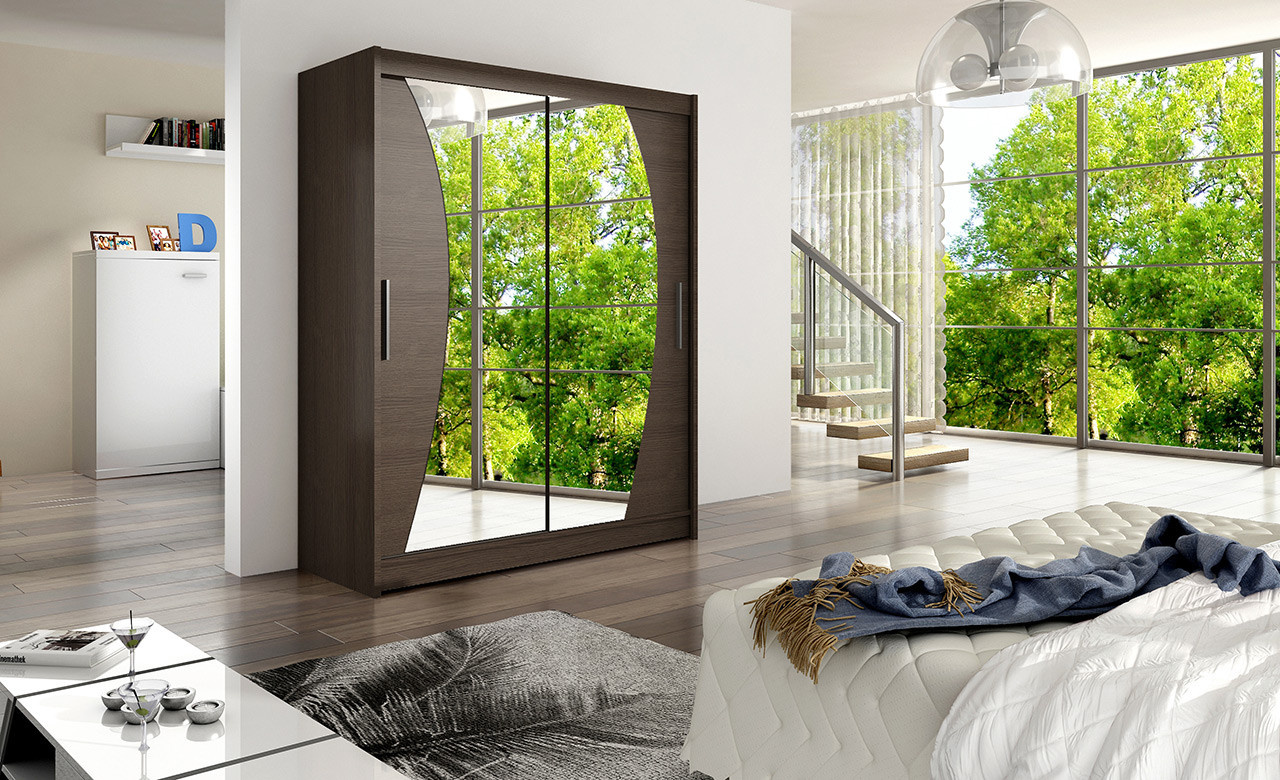 Jednoduchý a elegantní design skříně osloví i náročné zákazníky. Eleganci podtrhují dlouhé stříbrné úchyty a zrcadla, která jsou nalepena na dveřích skříně a po stranách zaříznutá do oblouku ve tvaru luku. Je vyrobena z lamina o síle 16 mm a hrany jsou ukončeny ABS lištou. Vodící lišty jsou vyrobeny z odolného hliníku a splňují požadavky pro každodenní užívání. Díky svému uspořádání poskytuje dostatek úložného prostoru a zrcadlo prostor opticky zvětší a prosvětlí. Skvěle se hodí do ložnice, předsíně, dětského, nebo studentského pokoje. Skříň je dodávána v demontu a součástí je montážní plánek včetně všech potřebných spojovacích materiálů. Vyobrazené dekorace nejsou v ceně.
