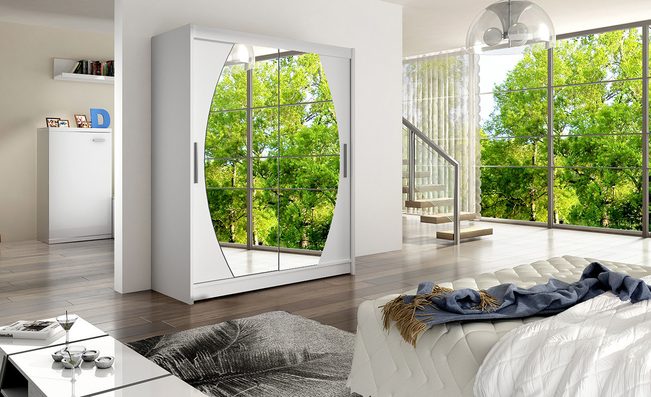 Jednoduchý a elegantní design skříně osloví i náročné zákazníky. Eleganci podtrhují dlouhé stříbrné úchyty a zrcadla, která jsou nalepena na dveřích skříně a po stranách zaříznutá do oblouku. Je vyrobena z lamina o síle 16 mm a hrany jsou ukončeny ABS lištou. Vodící lišty jsou vyrobeny z odolného hliníku a splňují požadavky pro každodenní užívání. Díky svému uspořádání poskytuje dostatek úložného prostoru a zrcadlo prostor opticky zvětší a prosvětlí. Skvěle se hodí do ložnice, předsíně, dětského, nebo studentského pokoje. Skříň je dodávána v demontu a součástí je montážní plánek včetně všech potřebných spojovacích materiálů. Vyobrazené dekorace nejsou v ceně.
