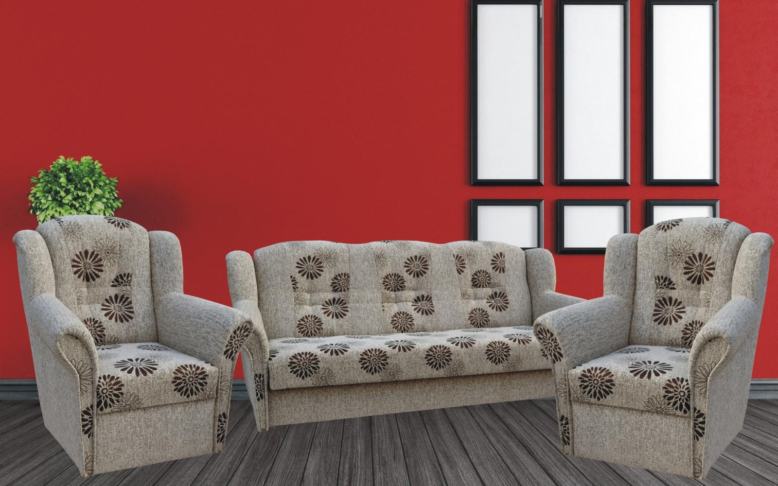 Klasická rozkládací sedací souprava vhodná také do menších bytů. Sedací souprava má praktický úložný prostor a jednoduchým rozkladem vznikne lůžko vhodné k příležitostnému spaní. Sedací souprava je pružinová v kombinaci s kvalitní PUR pěnou. Sedací souprava se skládá z rozkládacího trojsedu a dvou křesel. Tato sedačka je očalouněná kvalitní potahovou látkou, snadno čistitelnou suchou pěnou.