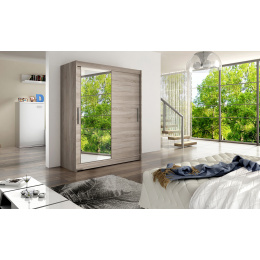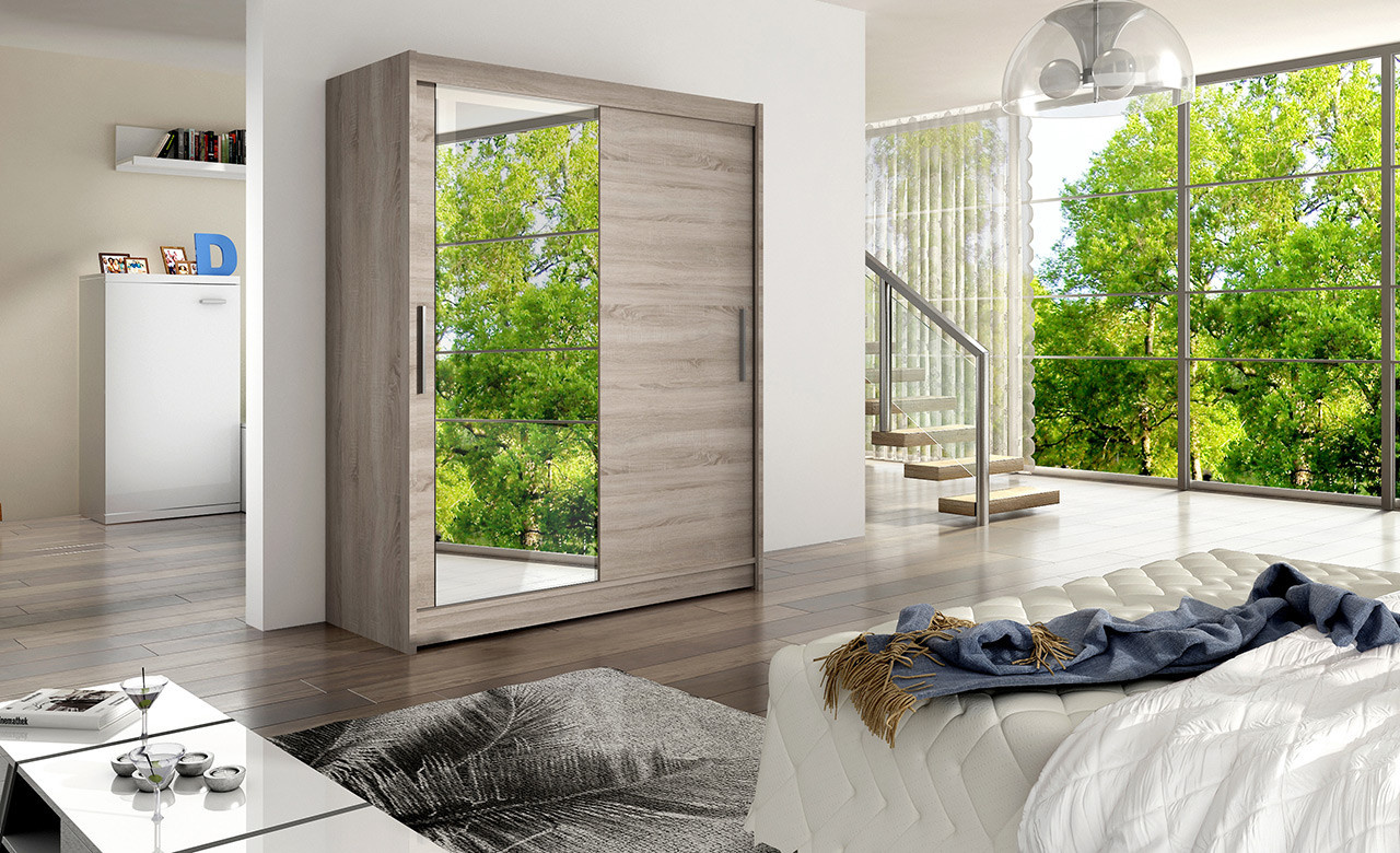 Jednoduchý a elegantní design skříně osloví i náročné zákazníky. Eleganci podtrhují dlouhé stříbrné úchyty a zrcadlo, které je nalepeno na dveřích skříně. Je vyrobena z lamina o síle 16 mm a hrany jsou ukončeny ABS lištou. Vodící lišty jsou vyrobeny z odolného hliníku a splňují požadavky pro každodenní užívání. Díky svému uspořádání poskytuje dostatek úložného prostoru a zrcadlo prostor opticky zvětší a prosvětlí. Skvěle se hodí do ložnice, předsíně, dětského, nebo studentského pokoje. Skříň je dodávána v demontu a součástí je montážní plánek včetně všech potřebných spojovacích materiálů. Vyobrazené dekorace nejsou v ceně.