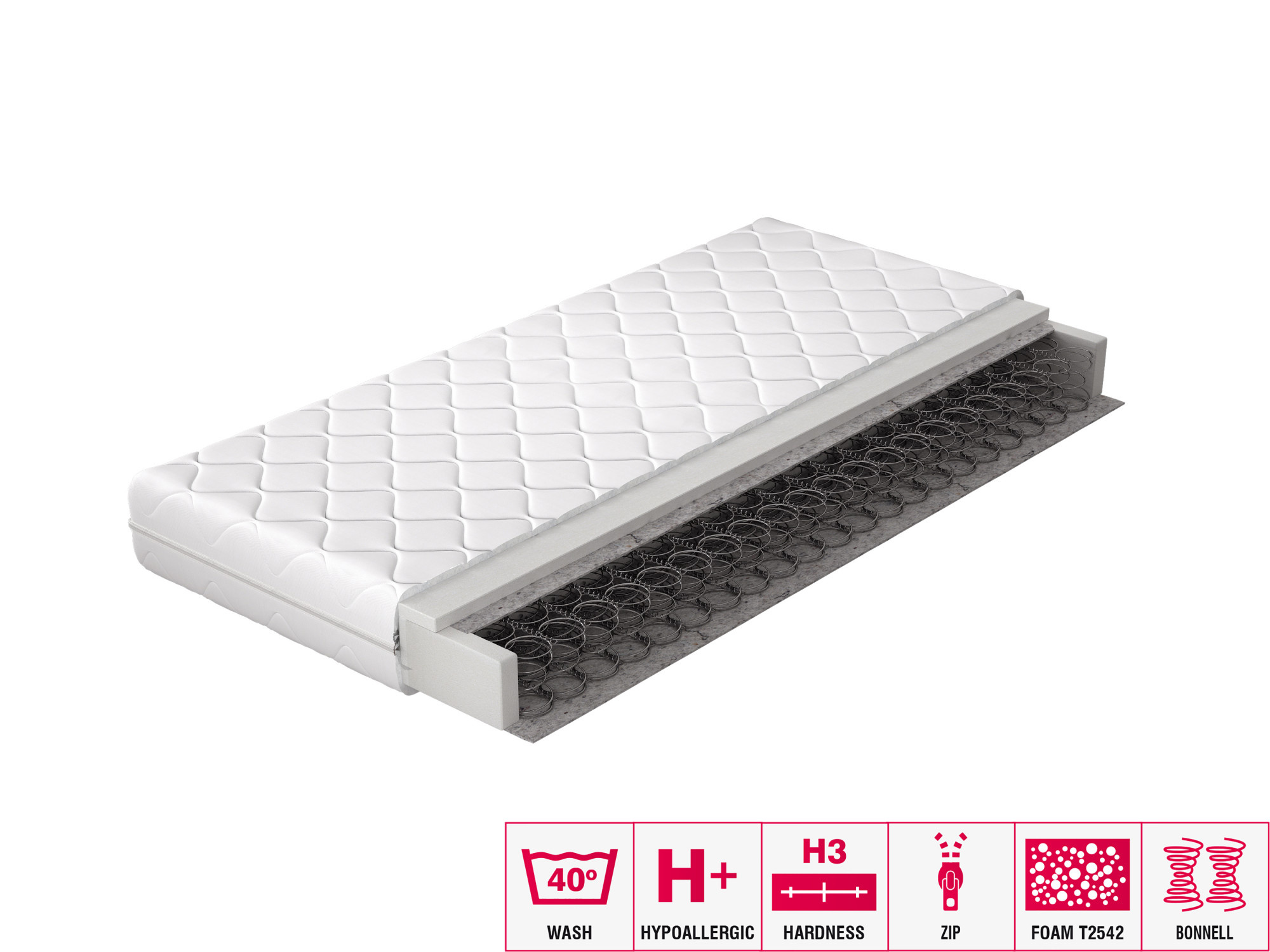 Zárukou dobrého nočního spánku je dokonale vybraná matrace. Víme, jak důležitá je tato volba, proto vám představujeme matraci OMINI bonell. Bonell pružina je zárukou, že se matrace během používání nedeformuje, což je nesmírně důležité pro pohodlí spánku. Bonellová pružina byla pokryta plstěnou podložkou, na kterou byla dodatečně nanesena pěna T2542. To vše je uzavřeno v odnímatelném krytu.