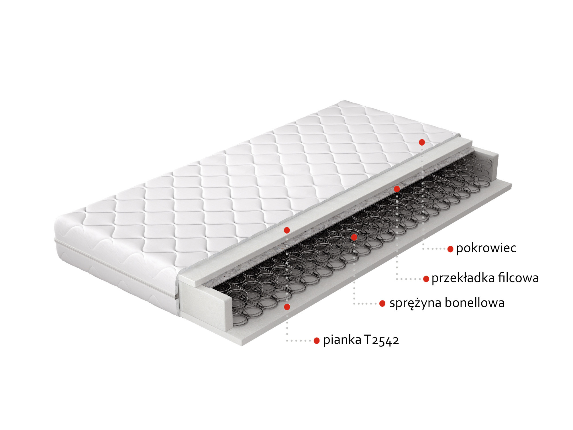 Zárukou dobrého nočního spánku je dokonale vybraná matrace. Víme, jak důležitá je tato volba, proto vám představujeme bonellovou matraci ORSOLA. Bonell pružina je zárukou, že se matrace během používání nedeformuje, což je nesmírně důležité pro pohodlí spánku. Bonellová pružina byla pokryta z obou stran plstěnou podložkou, na kterou byla z obou stran nanesena pěna T2542. To vše uzavřeno v odnímatelném krytu.