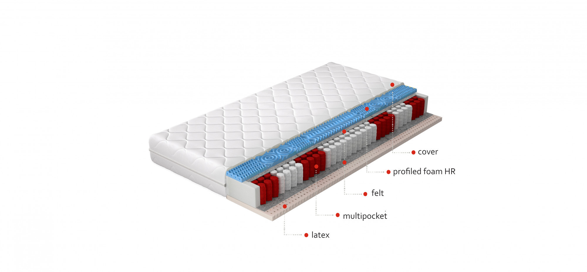 Matrace ACAPULCO je výrobek z nejkvalitnějších materiálů, ideální pro lidi, kteří si cení vynikající kvality spánku. Díky použití multipocket pružiny, která je z jedné strany obklopena vysoce flexibilní HR pěnou a z druhé strany latexovou pěnou, můžeme hovořit o pohodlném a odolném produktu. Další ochranu poskytují plstěné distanční podložky, které chrání pěny před deformací. Matrace s více kapsami je pokryta snímatelným potahem.
