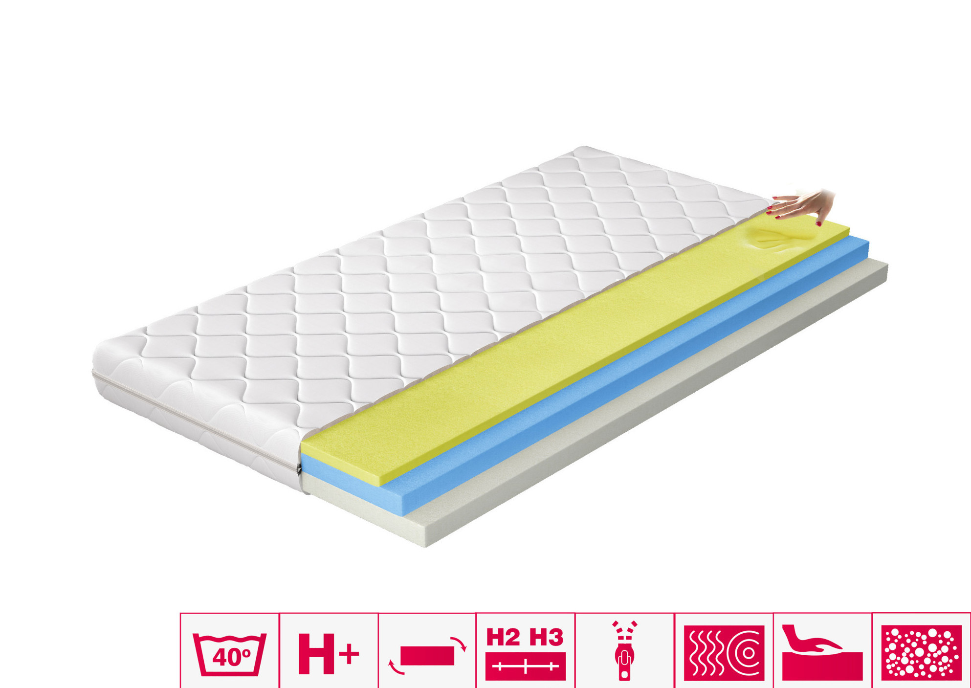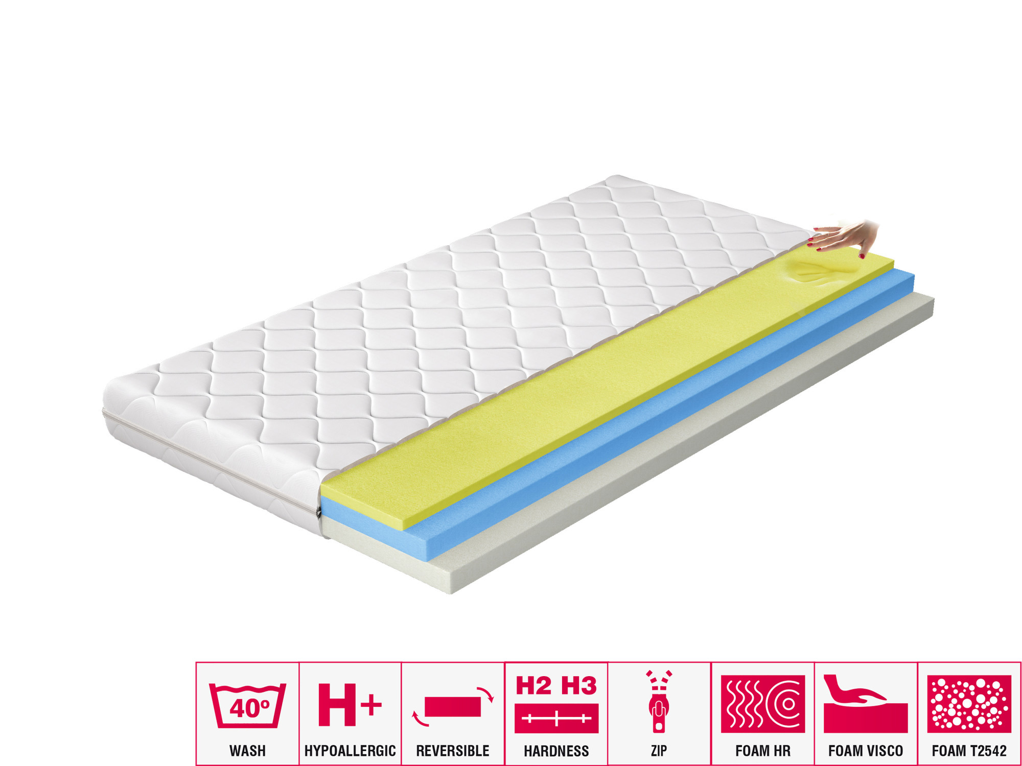 Matrace Simona je výrobek z nejkvalitnějších materiálů, ideální pro lidi, kteří si cení vynikající kvality spánku. Díky použití tří pěn je to mimořádně pohodlná matrace. Vysoce elastická HR pěna je obklopena Visco pěnou na jedné straně, která je extrémně měkká, a pěnou T2542 na druhé straně. Simona termoelastická matrace je pokryta snímatelným kašmírovým potahem.