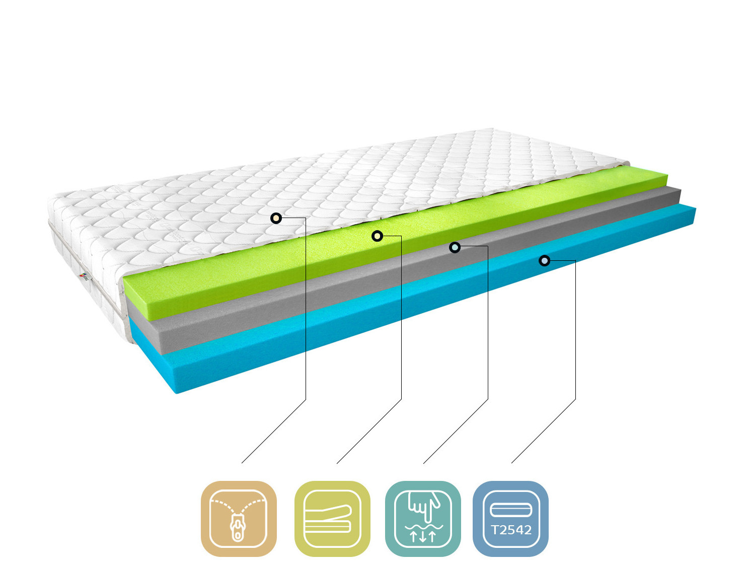 Matrace Simona je výrobek z nejkvalitnějších materiálů, ideální pro lidi, kteří si cení vynikající kvality spánku. Díky použití tří pěn je to mimořádně pohodlná matrace. Vysoce elastická HR pěna je obklopena Visco pěnou na jedné straně, která je extrémně měkká, a pěnou T2542 na druhé straně. Simona termoelastická matrace je pokryta snímatelným kašmírovým potahem.