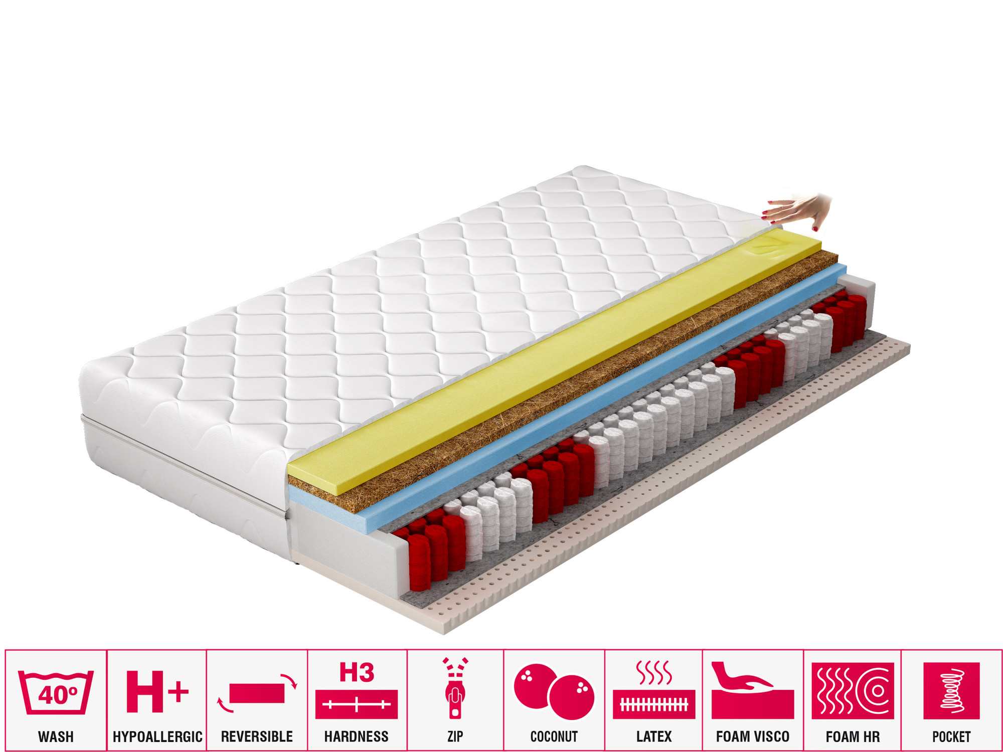 Pohodlný noční spánek je receptem na úspěšný den, proto si uvědomujeme důležitost výběru dokonalé matrace podle vašich preferencí. Termoelastická matrace Sola je ideální volbou pro lidi, kteří si cení kvalitního spánku. Matrace Sola se skládá z taštičkových pružin, díky kterým matrace nevlní ani nevibruje, a tří typů pěny. Latexová pěna na jedné straně a vysoce flexibilní HR pěna a Visco pěna na druhé, oddělené kokosovou deskou, která zvyšuje tvrdost matrace, celek je doplněn snímatelným potahem.