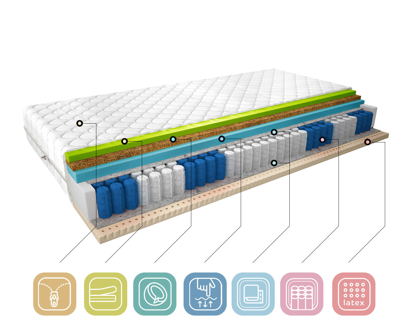 Pohodlný noční spánek je receptem na úspěšný den, proto si uvědomujeme, jak důležité je vybrat si dokonalou matraci podle vašich preferencí. Termoelastická matrace Sola ve stříbrném potahu je ideální volbou pro lidi, kteří si cení kvalitního spánku. Matrace Sola se skládá z taštičkových pružin, díky kterým matrace nevlní ani nevibruje, a tří typů pěny. Latexová pěna na jedné straně a vysoce flexibilní HR pěna a Visco pěna na druhé straně, oddělené kokosovou deskou, která zvyšuje tvrdost matrace, celek je doplněn snímatelným stříbrným potahem.