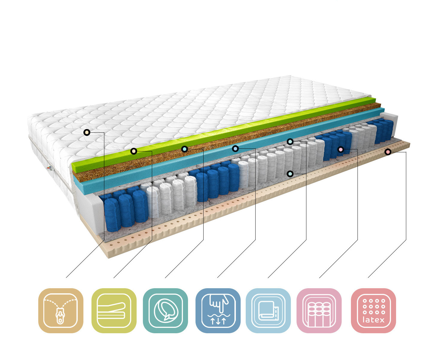 Pohodlný noční spánek je receptem na úspěšný den, proto si uvědomujeme, jak důležité je vybrat si dokonalou matraci podle vašich preferencí. Termoelastická matrace Sola ve stříbrném potahu je ideální volbou pro lidi, kteří si cení kvalitního spánku. Matrace Sola se skládá z taštičkových pružin, díky kterým matrace nevlní ani nevibruje, a tří typů pěny. Latexová pěna na jedné straně a vysoce flexibilní HR pěna a Visco pěna na druhé straně, oddělené kokosovou deskou, která zvyšuje tvrdost matrace, celek je doplněn snímatelným stříbrným potahem.