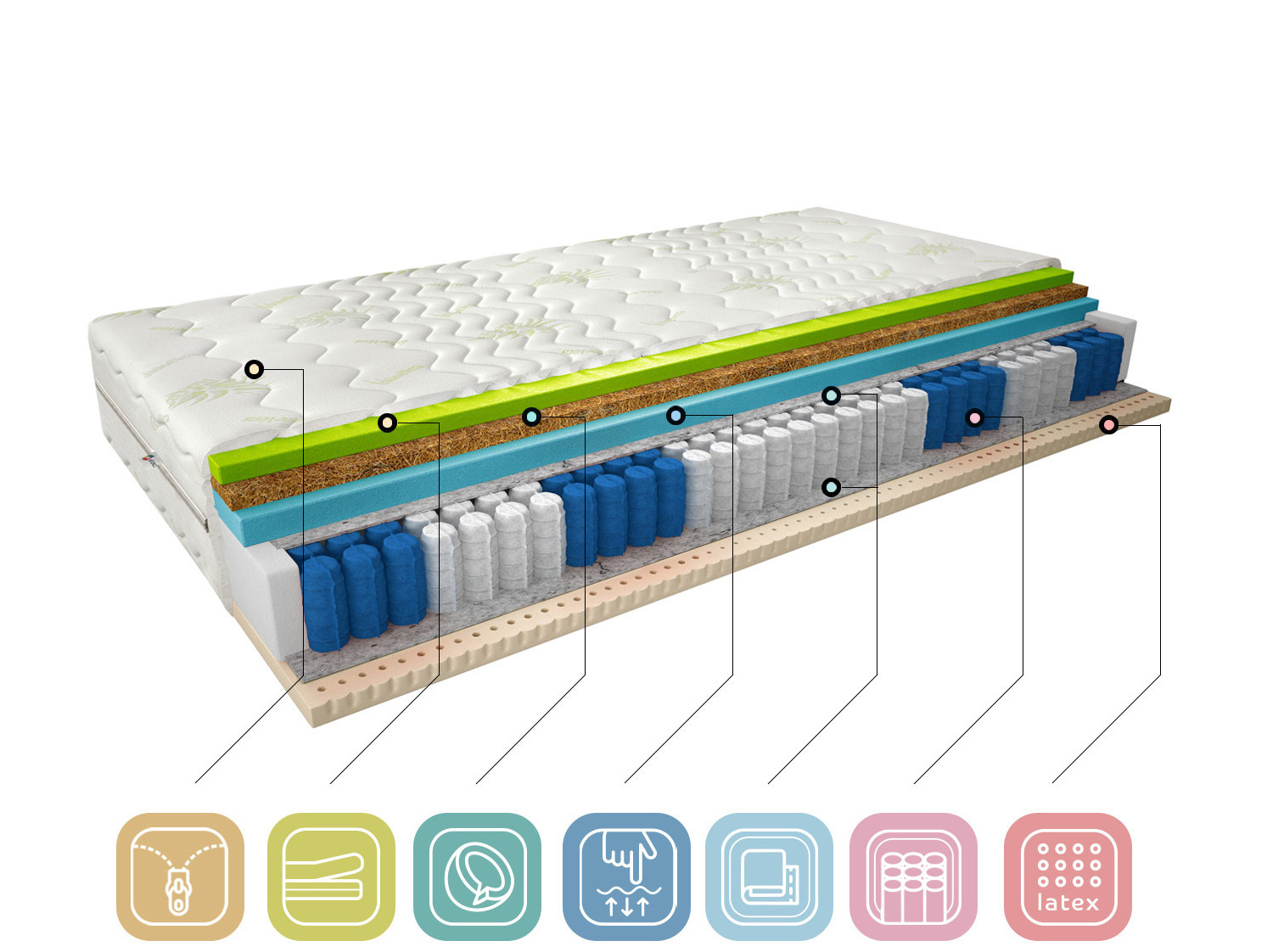 Pohodlný noční spánek je receptem na úspěšný den, proto si uvědomujeme důležitost výběru dokonalé matrace podle vašich preferencí. Termoelastická matrace Sola v potahu z aloe vera je ideální volbou pro lidi, kteří si cení kvalitního spánku. Matrace Sola se skládá z taštičkových pružin, které zajišťují, že matrace není vlnitá a nevibruje, a tří typů pěny. Latexová pěna na jedné straně a vysoce flexibilní HR pěna a Visco pěna na druhé straně, oddělené kokosovou deskou, která zvyšuje tvrdost matrace, celek je doplněn snímatelným potahem z aloe vera.