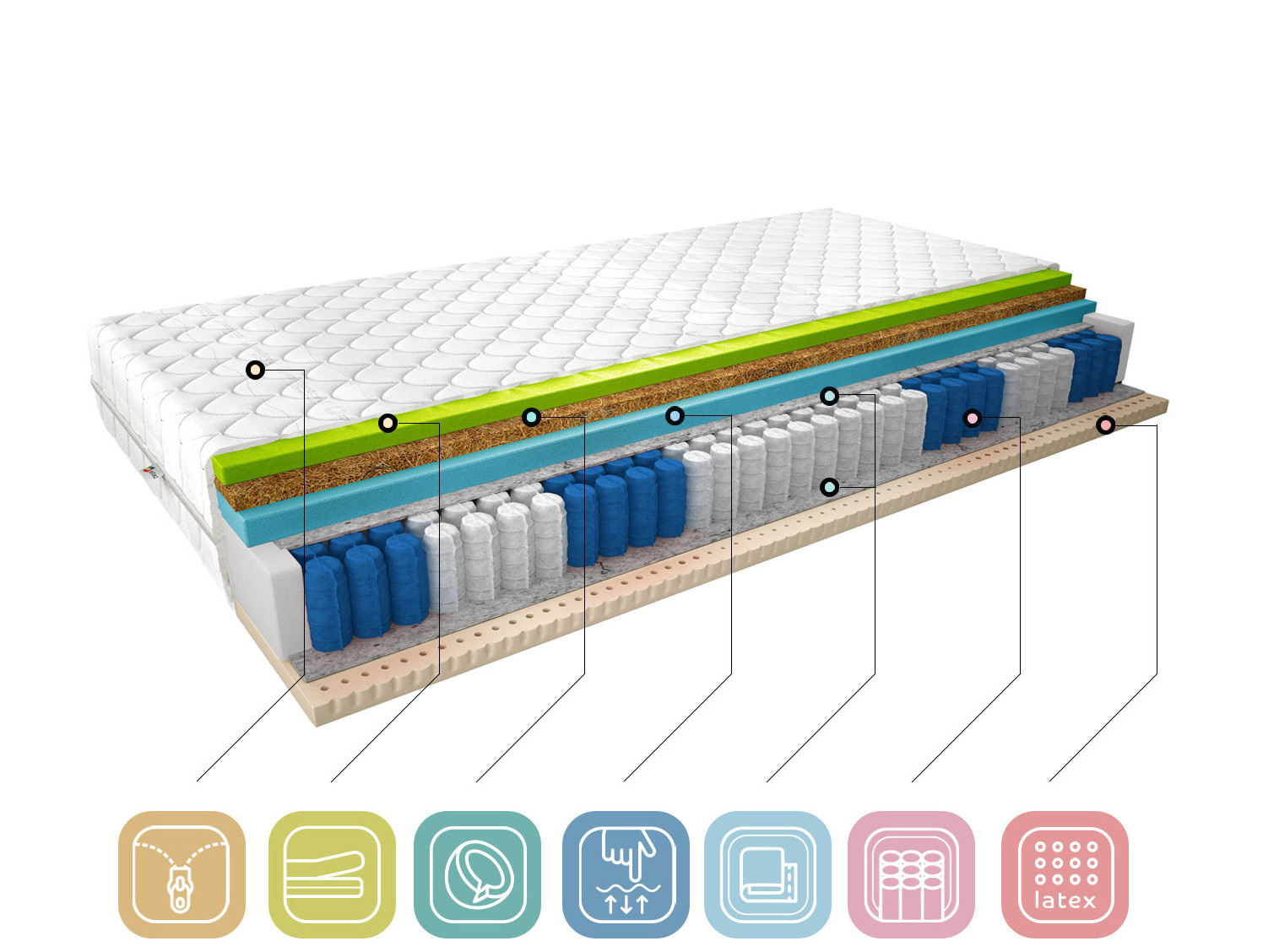 Pohodlný noční spánek je receptem na úspěšný den, proto si uvědomujeme, jak důležité je vybrat si dokonalou matraci podle vašich preferencí. Termoelastická matrace Sola ve stříbrném potahu je ideální volbou pro lidi, kteří si cení kvalitního spánku. Matrace Sola se skládá z taštičkových pružin, díky kterým matrace nevlní ani nevibruje, a tří typů pěny. Latexová pěna na jedné straně a vysoce flexibilní HR pěna a Visco pěna na druhé straně, oddělené kokosovou deskou, která zvyšuje tvrdost matrace, celek je doplněn snímatelným stříbrným potahem.