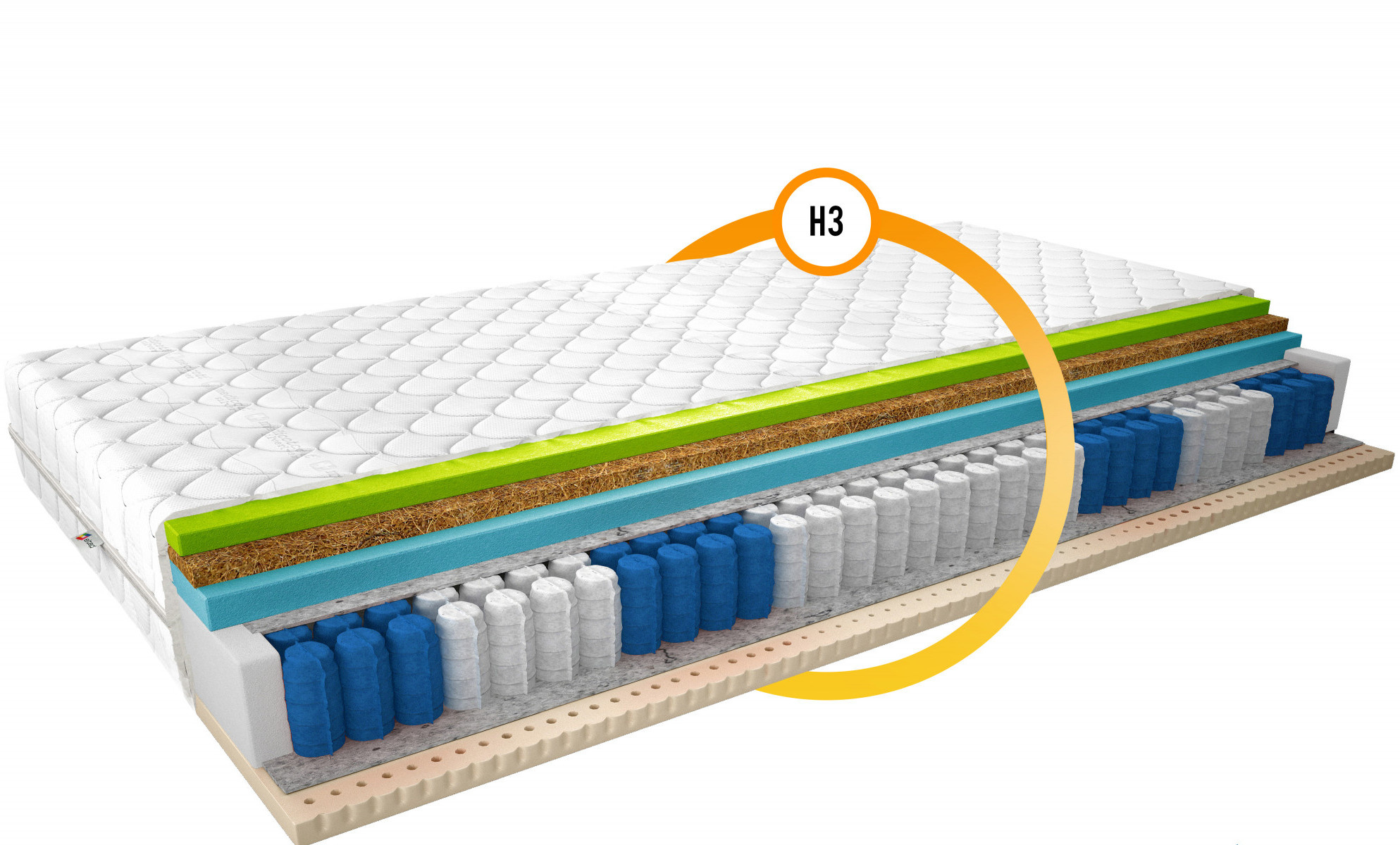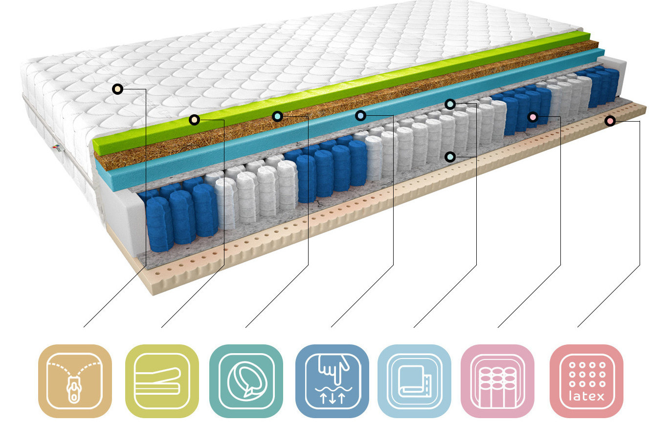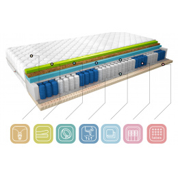 Potah matrace je vyroben z vysoce kvalitní tkaniny Medicott Silver, která je známá svými antibakteriálními a antialergickými vlastnostmi. Tato tkanina pomáhá udržovat matraci čistou a hygienickou, čímž snižuje riziko vzniku alergií a respiračních problémů. Medicott Silver je ideální volbou pro alergiky a osoby s citlivou pokožkou.