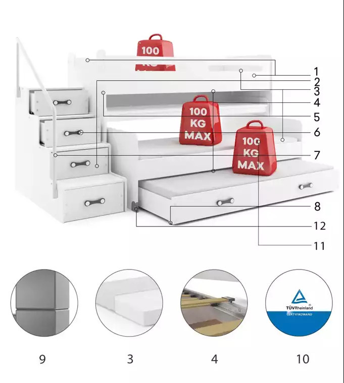 Dětská patrová postel s psacím stolem MAX 1 Bílá, bez matrace 80 X 200 , pro 3 osoby