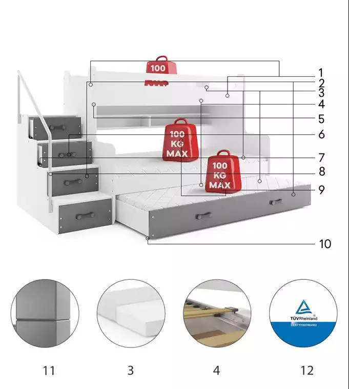 Dětská patrová postel MAX 3 Grafit, 3 místná 120 X 200