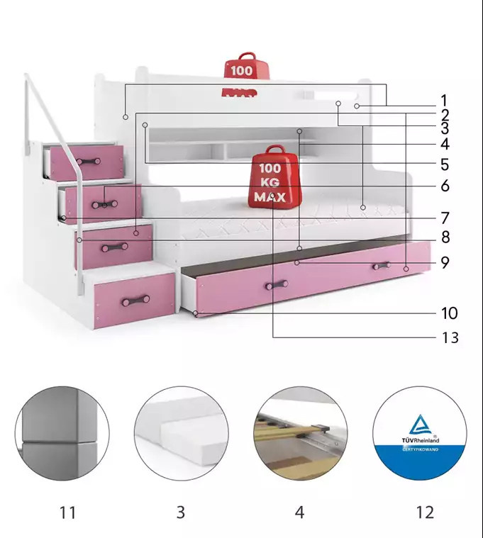 Dětská patrová postel MAX 3 Růžová bez matrace 120 X 200