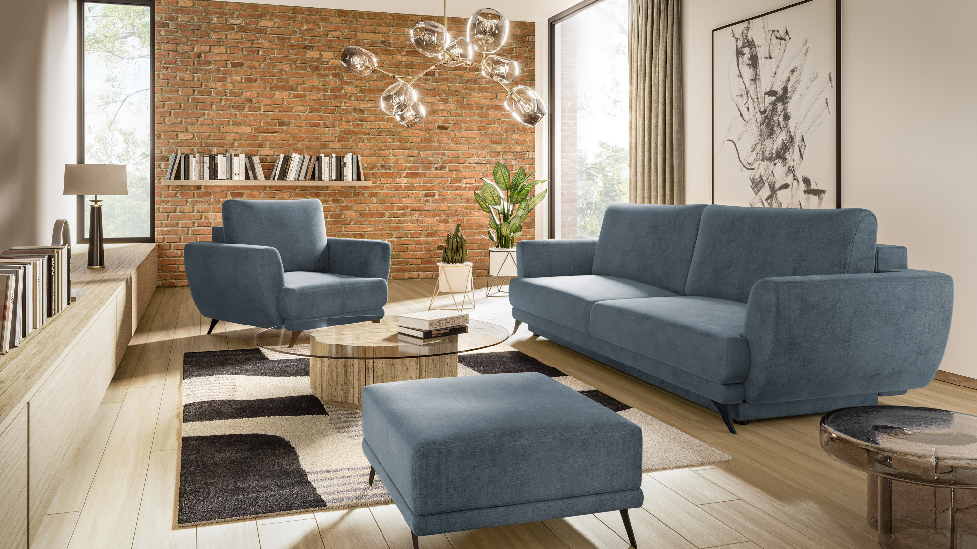 Megis lounge nábytek je velmi praktická sada, která zahrnuje: pohovku s rozměry - 250 x 95 x 90 cm, křeslo - 102 x 94 x 87 cm a taburet - 82 x 68 x 42 cm. Tento nábytek se vyznačuje vysokým komfortem používání, protože jeho sedáky jsou vyrobeny z vysoce elastické HR pěny. Vlnité pružiny uvnitř nábytku také přispívají k jeho úrovni pohodlí. Nohy pohovky, taburetu a křesla jsou z černé oceli s výškou až 13 centimetrů. Jednoduchý tvar, vysoké opěrky rukou neobvyklého tvaru a jemné prošívání jsou charakteristickými rysy sady Megis. Kromě vizuálních vlastností je sedací souprava také funkční. Pohovka je vybavena rozkládacím mechanismem typu DL, díky kterému získáme spací plochu o rozměrech: 200 x 145 cm. Pohovka má také úložný prostor na lůžkoviny umístěný v boxu. Každý prvek sady lze také zakoupit samostatně. Křeslo Megis, taburet a pohovka jsou vše, co potřebujete pro klidný odpočinek.