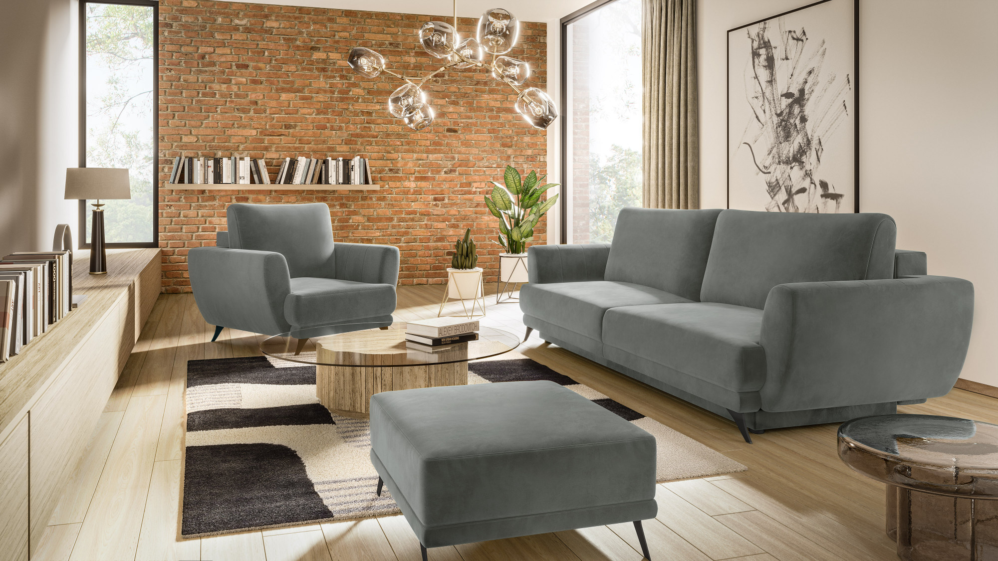 Megis lounge nábytek je velmi praktická sada, která zahrnuje: pohovku s rozměry - 250 x 95 x 90 cm, křeslo - 102 x 94 x 87 cm a taburet - 82 x 68 x 42 cm. Tento nábytek se vyznačuje vysokým komfortem používání, protože jeho sedáky jsou vyrobeny z vysoce elastické HR pěny. Vlnité pružiny uvnitř nábytku také přispívají k jeho úrovni pohodlí. Nohy pohovky, taburetu a křesla jsou z černé oceli s výškou až 13 centimetrů. Jednoduchý tvar, vysoké opěrky rukou neobvyklého tvaru a jemné prošívání jsou charakteristickými rysy sady Megis. Kromě vizuálních vlastností je sedací souprava také funkční. Pohovka je vybavena rozkládacím mechanismem typu DL, díky kterému získáme spací plochu o rozměrech: 200 x 145 cm. Pohovka má také úložný prostor na lůžkoviny umístěný v boxu. Každý prvek sady lze také zakoupit samostatně. Křeslo Megis, taburet a pohovka jsou vše, co potřebujete pro klidný odpočinek.