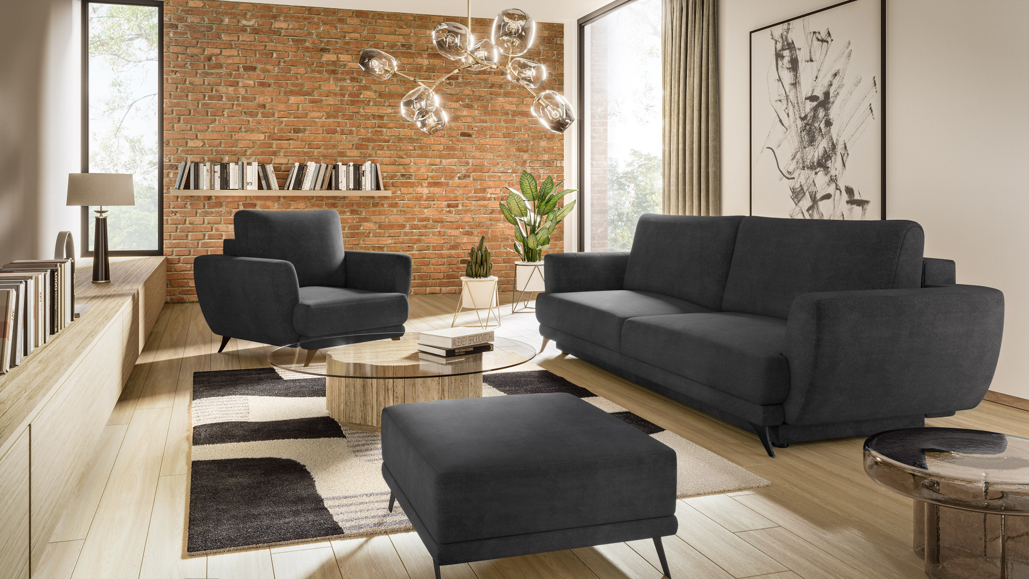 Megis lounge nábytek je velmi praktická sada, která zahrnuje: pohovku s rozměry - 250 x 95 x 90 cm, křeslo - 102 x 94 x 87 cm a taburet - 82 x 68 x 42 cm. Tento nábytek se vyznačuje vysokým komfortem používání, protože jeho sedáky jsou vyrobeny z vysoce elastické HR pěny. Vlnité pružiny uvnitř nábytku také přispívají k jeho úrovni pohodlí. Nohy pohovky, taburetu a křesla jsou z černé oceli s výškou až 13 centimetrů. Jednoduchý tvar, vysoké opěrky rukou neobvyklého tvaru a jemné prošívání jsou charakteristickými rysy sady Megis. Kromě vizuálních vlastností je sedací souprava také funkční. Pohovka je vybavena rozkládacím mechanismem typu DL, díky kterému získáme spací plochu o rozměrech: 200 x 145 cm. Pohovka má také úložný prostor na lůžkoviny umístěný v boxu. Každý prvek sady lze také zakoupit samostatně. Křeslo Megis, taburet a pohovka jsou vše, co potřebujete pro klidný odpočinek.