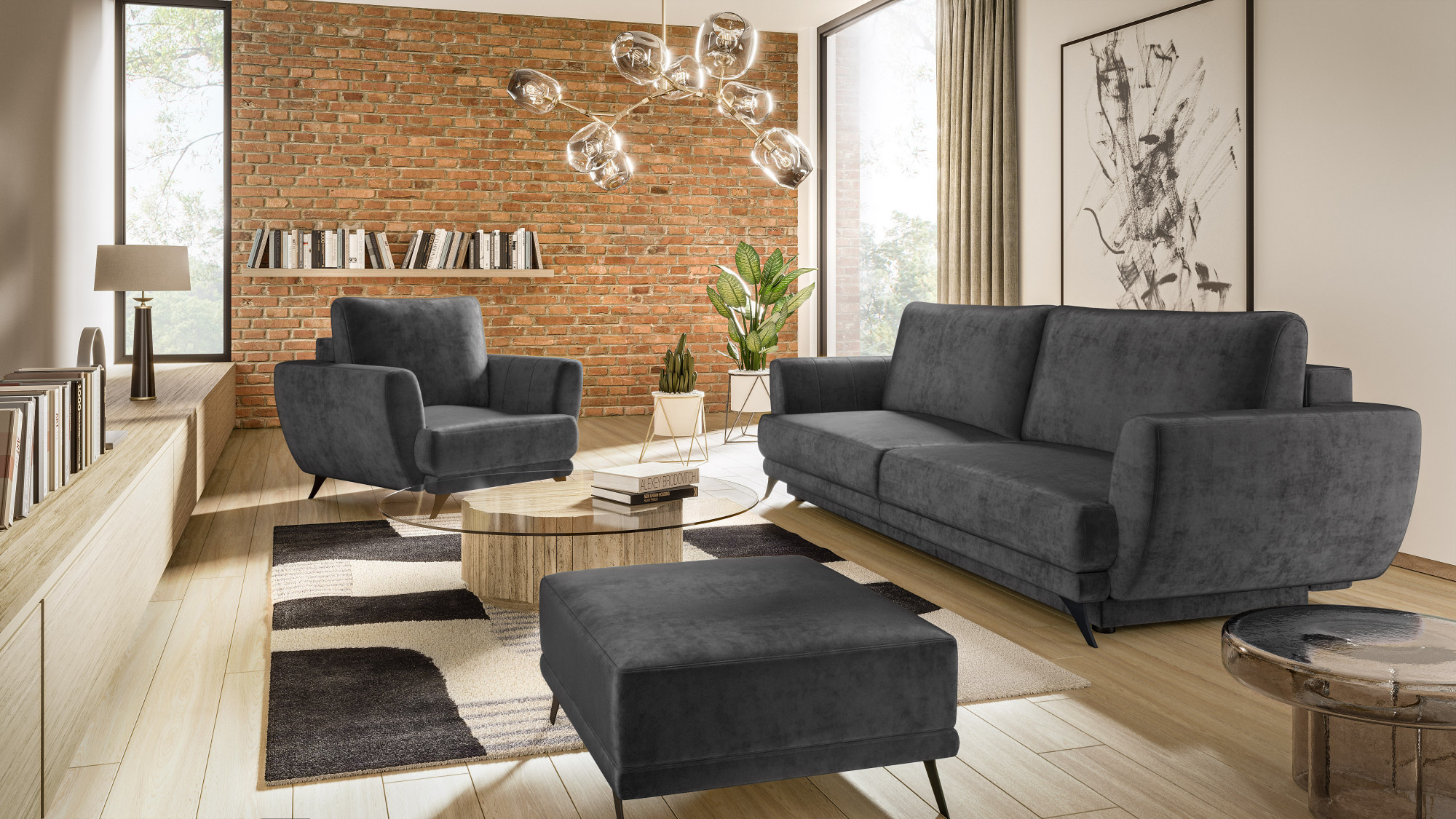 Megis lounge nábytek je velmi praktická sada, která zahrnuje: pohovku s rozměry - 250 x 95 x 90 cm, křeslo - 102 x 94 x 87 cm a taburet - 82 x 68 x 42 cm. Tento nábytek se vyznačuje vysokým komfortem používání, protože jeho sedáky jsou vyrobeny z vysoce elastické HR pěny. Vlnité pružiny uvnitř nábytku také přispívají k jeho úrovni pohodlí. Nohy pohovky, taburetu a křesla jsou z černé oceli s výškou až 13 centimetrů. Jednoduchý tvar, vysoké opěrky rukou neobvyklého tvaru a jemné prošívání jsou charakteristickými rysy sady Megis. Kromě vizuálních vlastností je sedací souprava také funkční. Pohovka je vybavena rozkládacím mechanismem typu DL, díky kterému získáme spací plochu o rozměrech: 200 x 145 cm. Pohovka má také úložný prostor na lůžkoviny umístěný v boxu. Každý prvek sady lze také zakoupit samostatně. Křeslo Megis, taburet a pohovka jsou vše, co potřebujete pro klidný odpočinek.