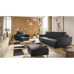 Megis lounge nábytek je velmi praktická sada, která zahrnuje: pohovku s rozměry - 250 x 95 x 90 cm, křeslo - 102 x 94 x 87 cm a taburet - 82 x 68 x 42 cm. Tento nábytek se vyznačuje vysokým komfortem používání, protože jeho sedáky jsou vyrobeny z vysoce elastické HR pěny. Vlnité pružiny uvnitř nábytku také přispívají k jeho úrovni pohodlí. Nohy pohovky, taburetu a křesla jsou z černé oceli s výškou až 13 centimetrů. Jednoduchý tvar, vysoké opěrky rukou neobvyklého tvaru a jemné prošívání jsou charakteristickými rysy sady Megis. Kromě vizuálních vlastností je sedací souprava také funkční. Pohovka je vybavena rozkládacím mechanismem typu DL, díky kterému získáme spací plochu o rozměrech: 200 x 145 cm. Pohovka má také úložný prostor na lůžkoviny umístěný v boxu. Každý prvek sady lze také zakoupit samostatně. Křeslo Megis, taburet a pohovka jsou vše, co potřebujete pro klidný odpočinek.