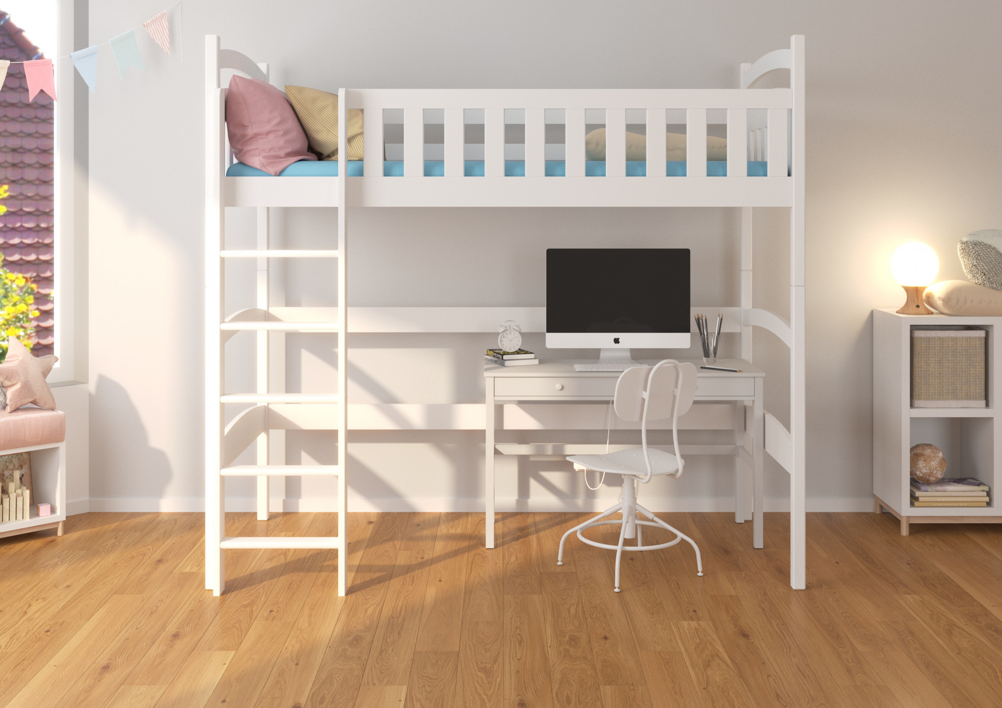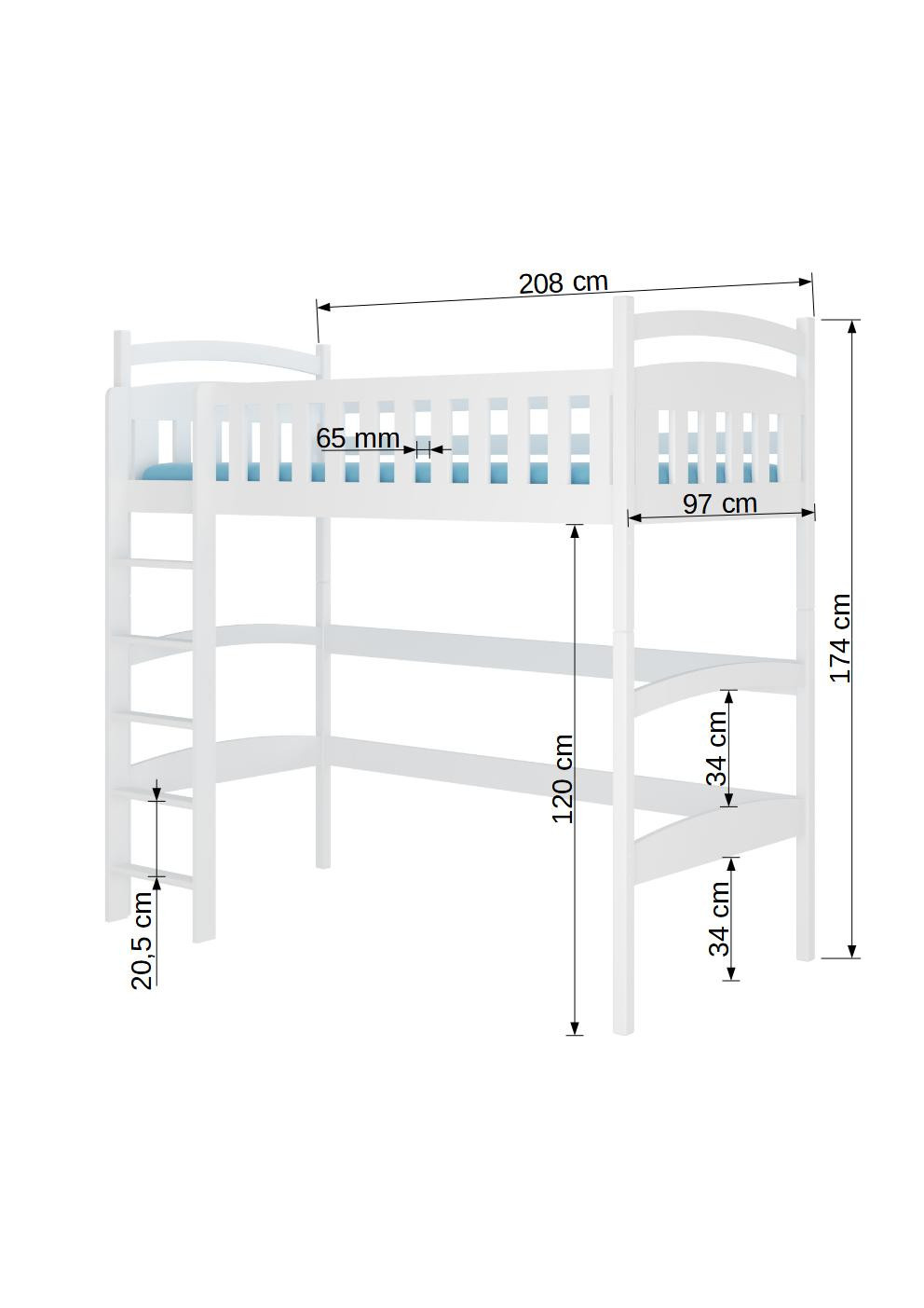 Postel na vyvýšeném patře MIAGO je patrová verze pro jedno dítě. Je to ideální řešení pro malé prostory. Horní část slouží jako pohodlné místo na spaní. Naopak, prostor pod postelí lze využít jako úložný prostor, místo pro práci nebo hraní. Součástí sady je odolný rám vyrobený z březové lamely typu FLEX a pěnová matrace o tloušťce 8 cm.