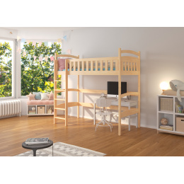 Postel na vyvýšeném patře MIAGO je patrová verze pro jedno dítě. Je to ideální řešení pro malé prostory. Horní část slouží jako pohodlné místo na spaní. Naopak, prostor pod postelí lze využít jako úložný prostor, místo pro práci nebo hraní. Součástí sady je odolný rám vyrobený z březové lamely typu FLEX. Matrace není součástí postele.