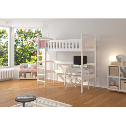 Postel na vyvýšeném patře MIAGO je patrová verze pro jedno dítě. Je to ideální řešení pro malé prostory. Horní část slouží jako pohodlné místo na spaní. Naopak, prostor pod postelí lze využít jako úložný prostor, místo pro práci nebo hraní. Součástí sady je odolný rám vyrobený z březové lamely typu FLEX a pěnová matrace o tloušťce 8 cm.
