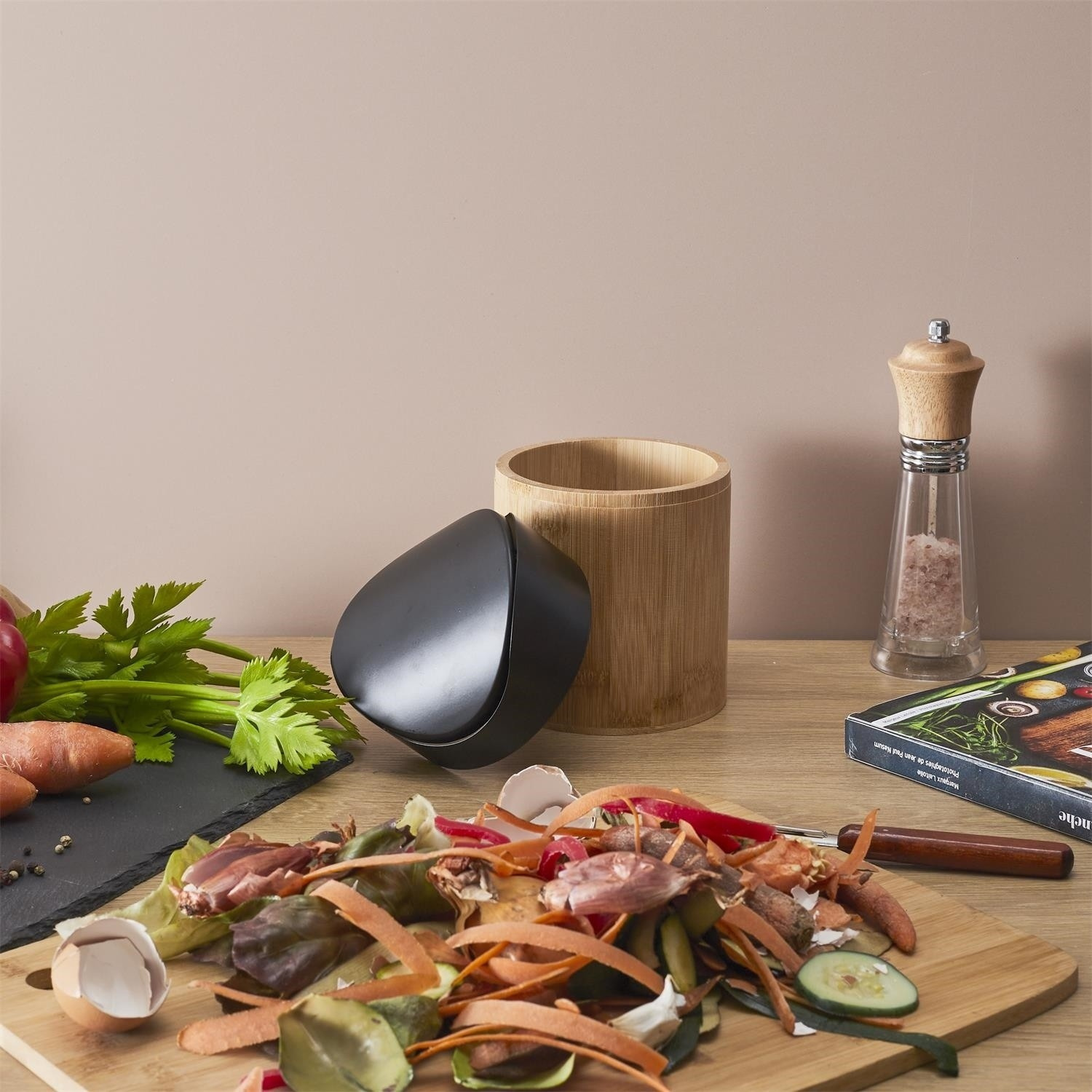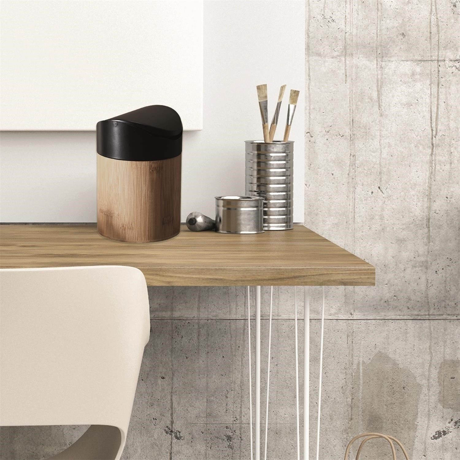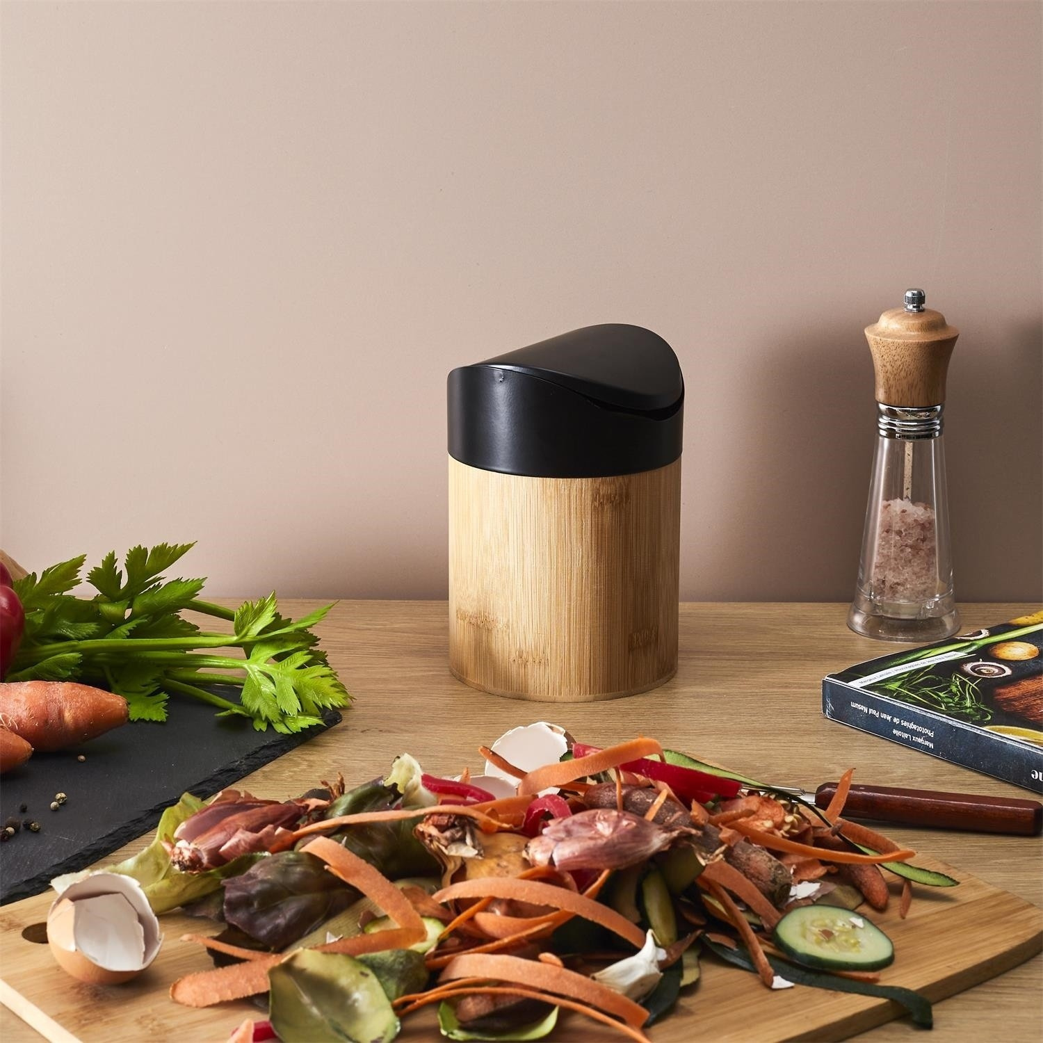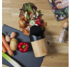 Mini koš z bambusového dřeva je ideální nádobou sloužící jako kompostér nebo na organický odpad v kuchyni. Mini koš vybavený otočným víkem se osvědčí při přípravě pokrmů a také bude ideálním mini kontejnerem na odpadky např. v koupelně nebo v kanceláři. Objem 1 litr. Plastový kryt. Korpus dřevo bambusové.