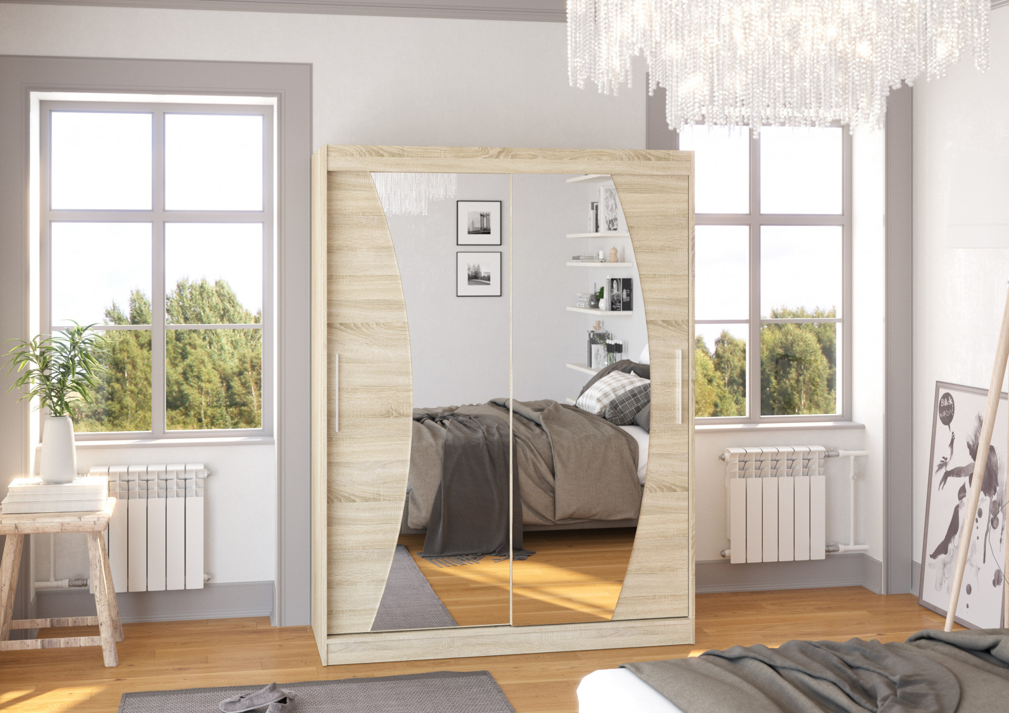 Šatní skříň s posuvnými dveřmi a zrcadlem MODESTO je ideálním způsobem, jak uspořádat prostor. Nábytek je vybaven prostornými policemi a tyčí, na kterou můžete pověsit šaty, obleky, svrchní oděvy nebo košile. Na čelní straně bylo připevněno zrcadlo, které opticky zvětšuje prostor. Díky tomu, že skříň je posuvná, nemusíte vyčleňovat další místo na otevření dveří, což z ní činí ideální řešení pro malý pokoj nebo úzkou předsíň.