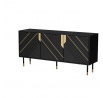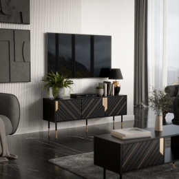 MOUNTAIN TV skříňka 150(3D) rozměry: V/Š/H - 55cm/154cm/40cm materiál: korpus: laminovaná deska 16 mm čela: černá matná MDF deska 16mm + zlaté lakované prvky Nohy: kovové (černé/zlaté), výška 18 cm Úchyt: systém PUSH TO OPEN