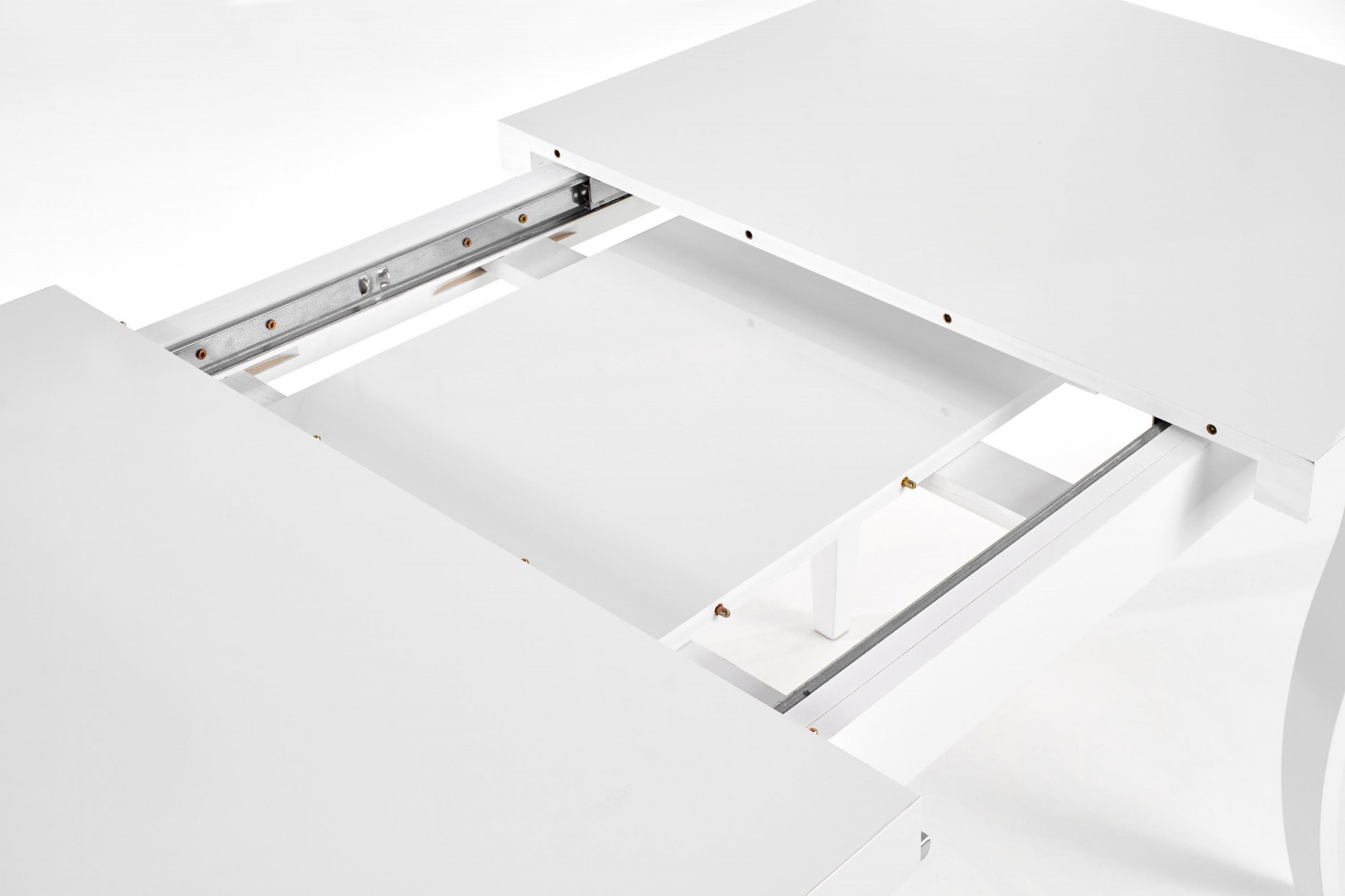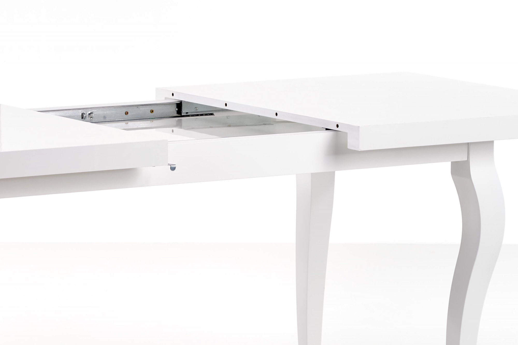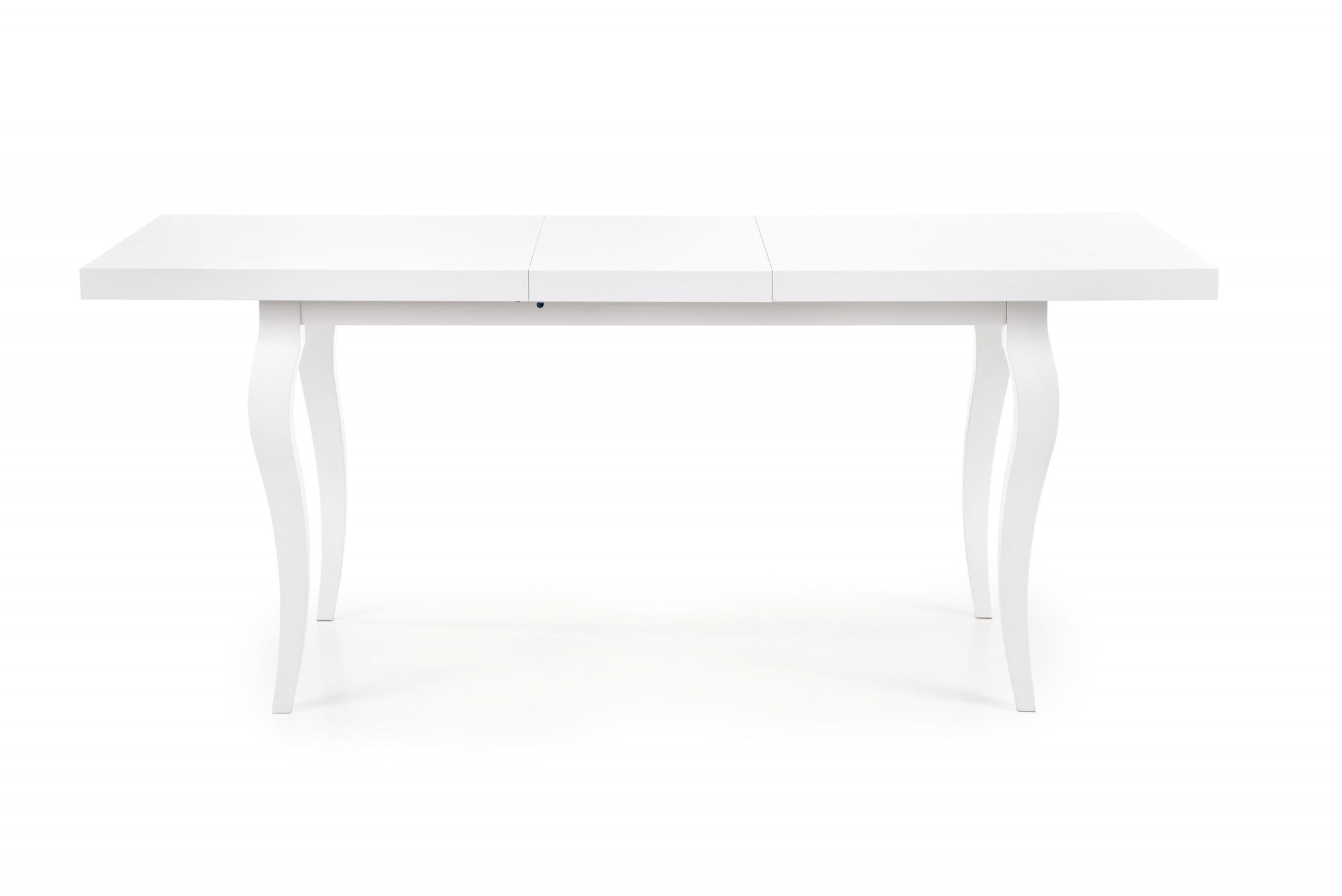 rozkládací stůl, rozměry: 140-180/80/75 cm, materiál: horní deska - MDF laminovaná deska + ABS hrany, nohy - masivní dřevo (buk), barva: bílá