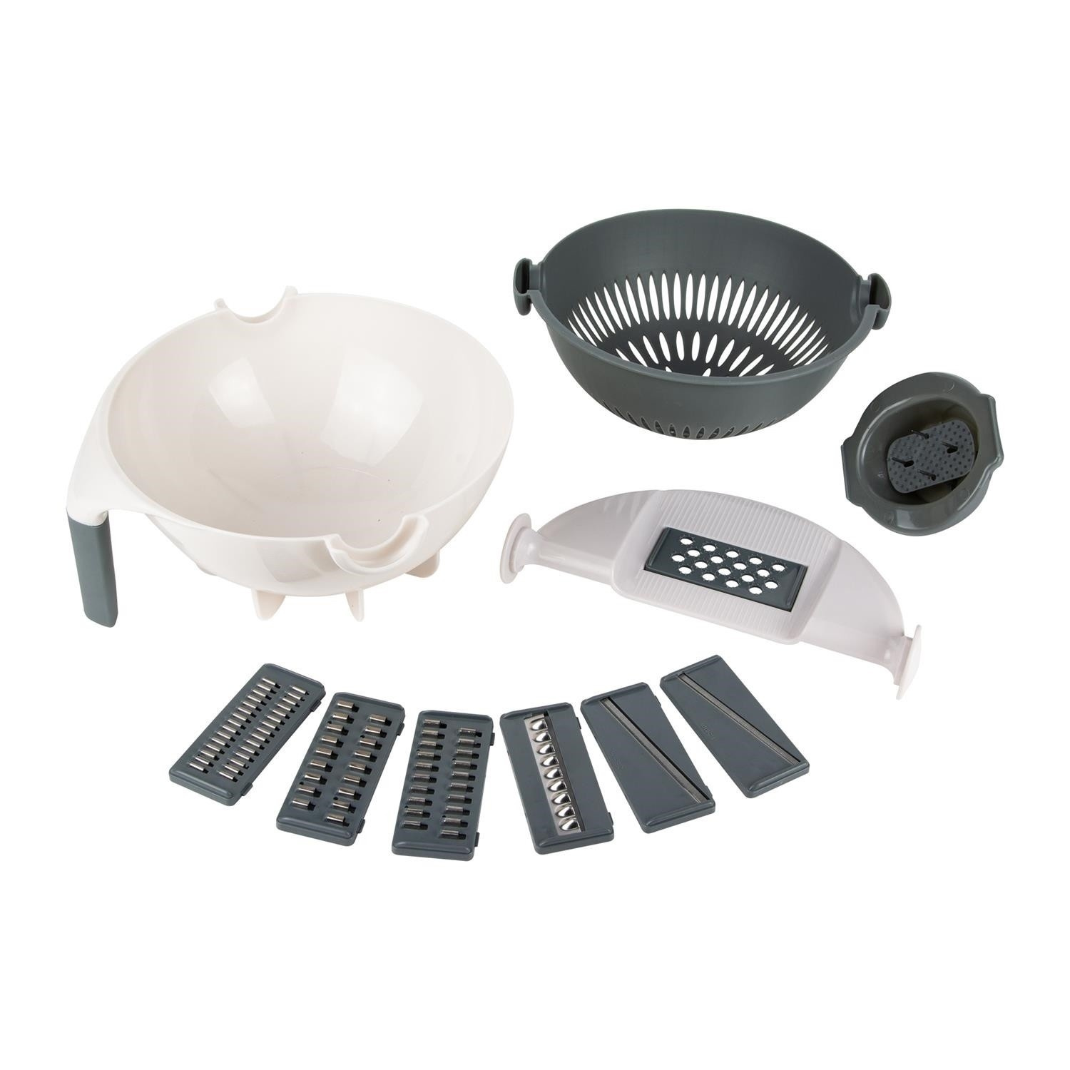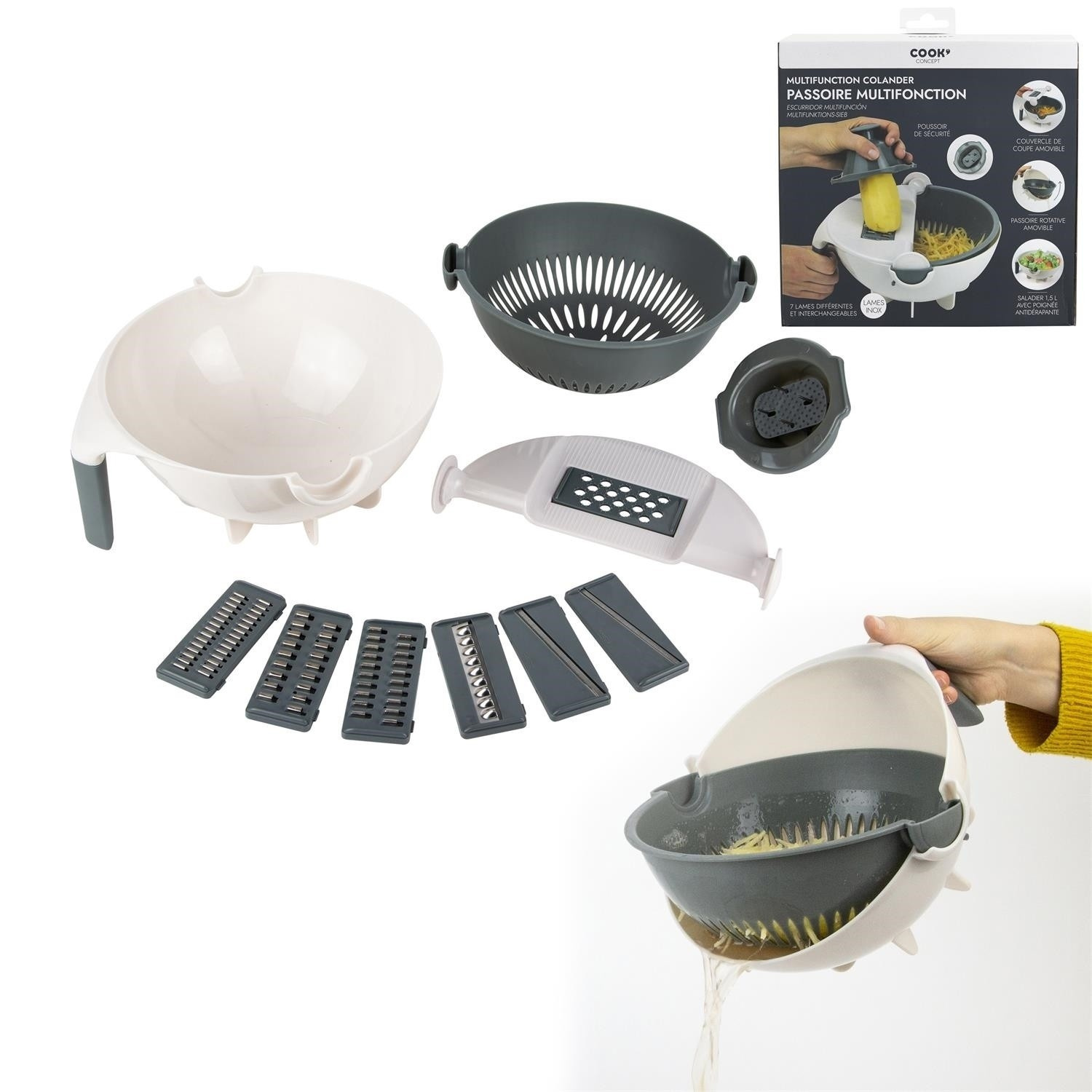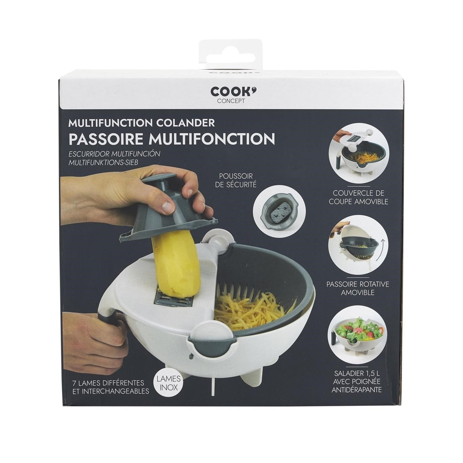 Neztrácej čas a místo díky této multifunkční struhadlu na zeleninu. Obsahuje: 1 bezpečnostní tlačítko. 1 snímatelný kryt řezacího zařízení. 1 vyjímatelné otočné sítko. 7 různých a vyměnitelných čepelí. 1 miska o objemu 1,5 l s protiskluzovým úchytem - Složení: Plast. Plast Ideální struhadlo na strouhání a odkapávání brambor na placky nebo okurek na salát.